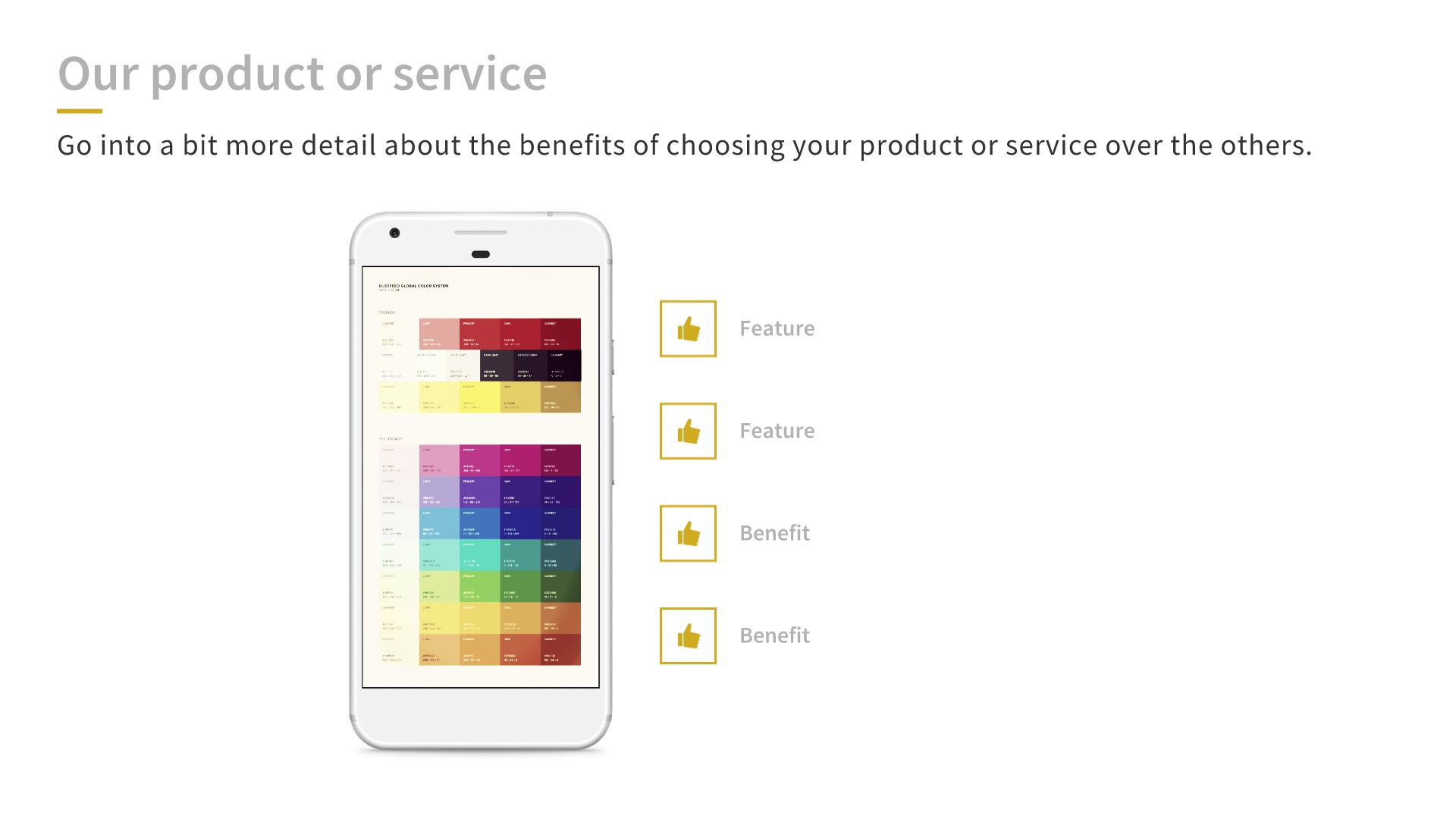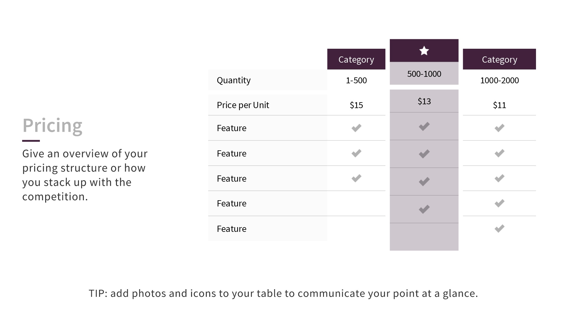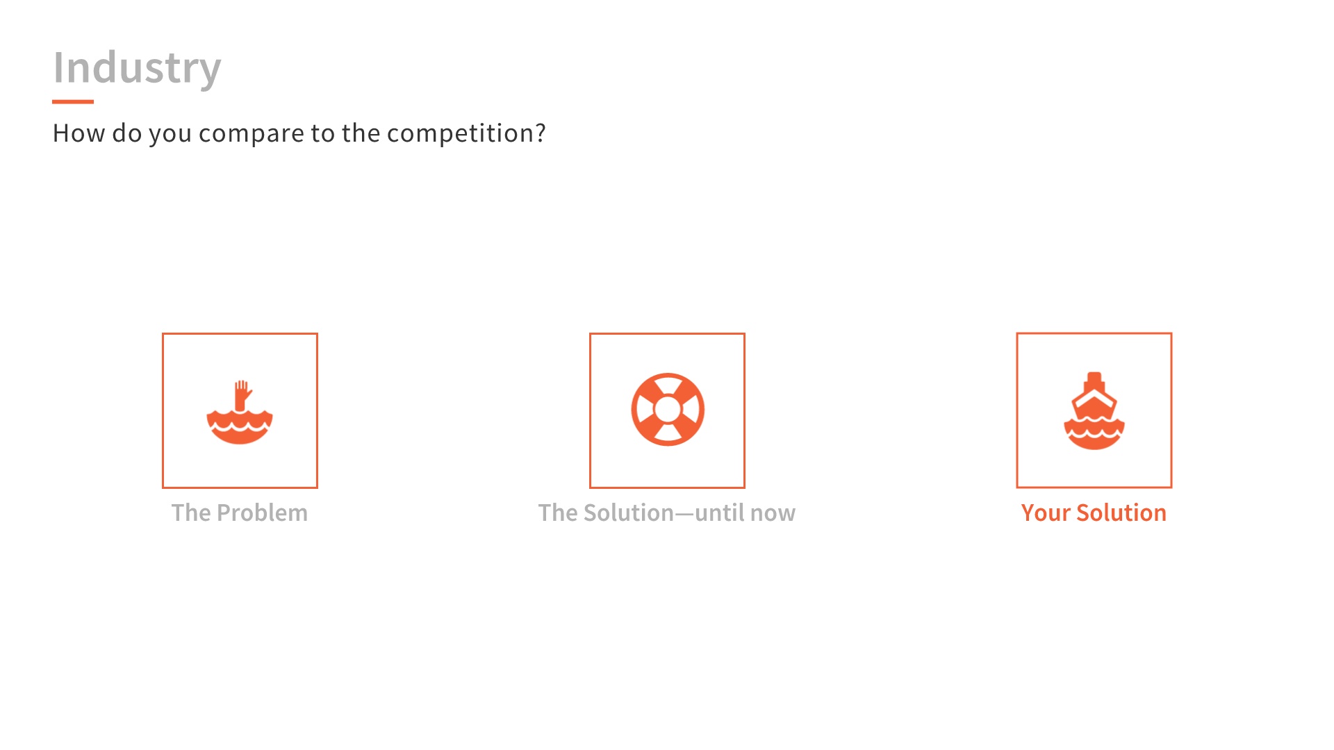 Sure, you might not be the only option available on the market. And they’ve likely done their homework and are aware of your competitors. This slide pits you against the competition and shows how you differentiate from other companies in the same industry— and why you’re the best choice.