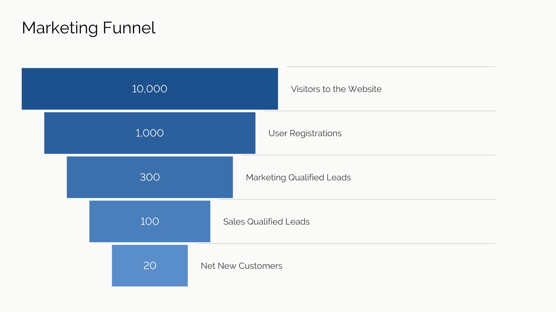 Who doesn't love the marketing funnel? We've seen some crazy ones in our time, and have found the simpler ones are the better ones. As mentioned before, all Sales really cares about are SQLs and Won deals. But you still will want to share your thinking on how leads will progress through your funnel. It's often best to present this as a cohort, that is, a visualization of leads who registered in a given and how many converted to MQLs, SQLs, etc. It may take a week or two for all your MQLs to to convert over (or not) to SQLs so there is always a time lag in there.