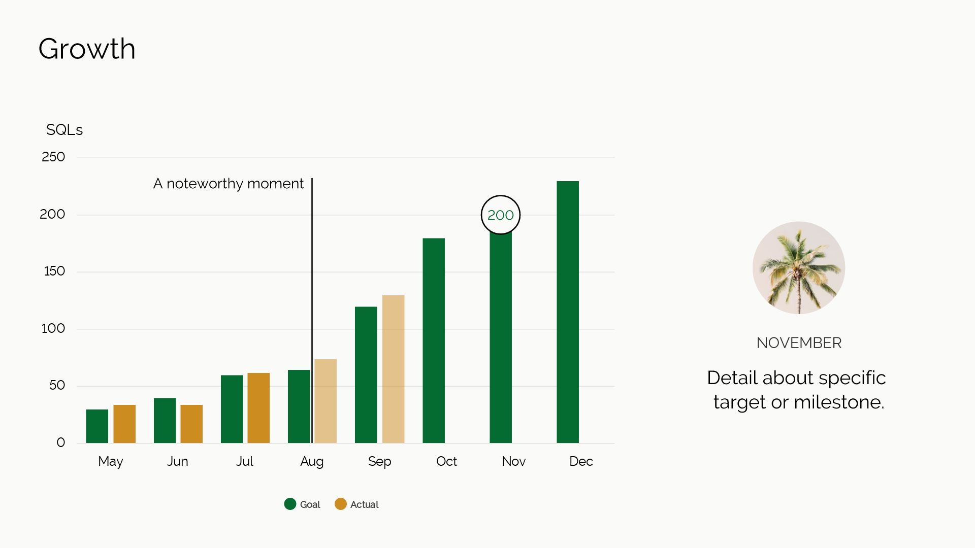 Chances are you're a ways away from hitting your Big Goal. So, you gotta show the incremental climb for how you'll get there. Show historicals so folks can see your current growth trajectory and highlight when you'll reach your big goal. Of course there's a spreadsheet that cascades these numbers down to specific campaigns. But this is not the moment for those details. The simple message is the growth curve is reasonable.
