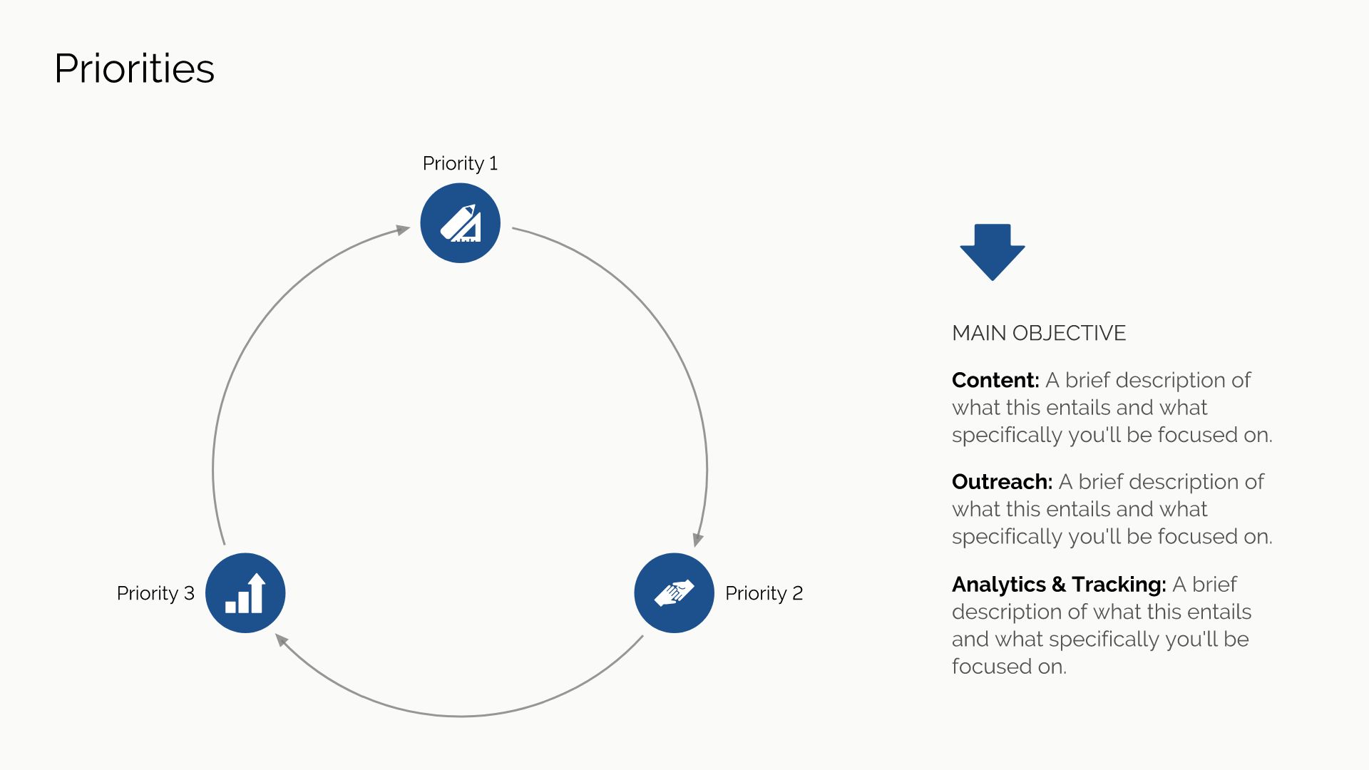 Highlighting a single, high-impact goal at the start of your marketing plan demonstrates you have a handle on what drives the business. For everything that follows you should be able to trace a line back to this goal. For now, show the clarity of your vision by keeping the slide simple. Sure, there's much to discuss here. But that doesn't mean you need to plaster it all on the slide.