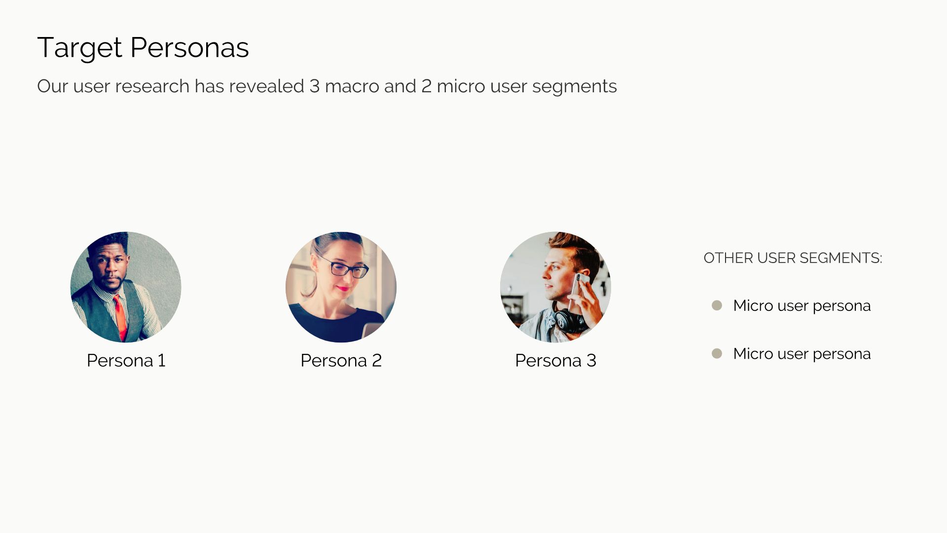 Selecting your target personas bridges the strategic and tactical marketing gap. It implies you've already done your segmentation and now you're ready to discuss the exact humans you'll be targeting for each segment. You don't need the details on each, simply point out who you'll be targeting and why at a high level. Some will be the actual buyers, some will be just influencers, etc. Make sure you make that point to avoid confusing sales folks.