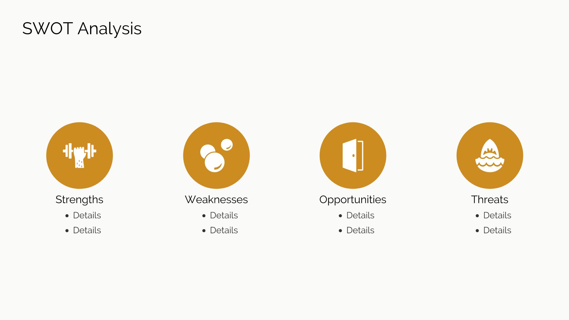 A SWOT analysis is an effective way to encapsulate a whole lot of thinking in a single slide. You may have other detailed versions of the SWOT analysis, but this one should only hit the highlights. And while the slide may be simple, the work needed to distill down your tribal knowledge is going to take some doing. Plan your time accordingly.