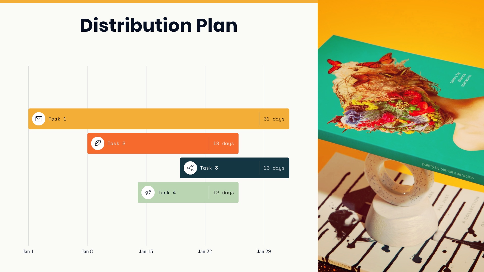When you need to share important project dates or milestones with your team, add a calendar slide to your next presentation. Organizing your schedule into a calendar format can help people memorize and recall dates more easily. A calendar slide makes more of an impact than a long list of dates in bullet points, and can be easier to read and reference at a glance than more complicated project management charts.