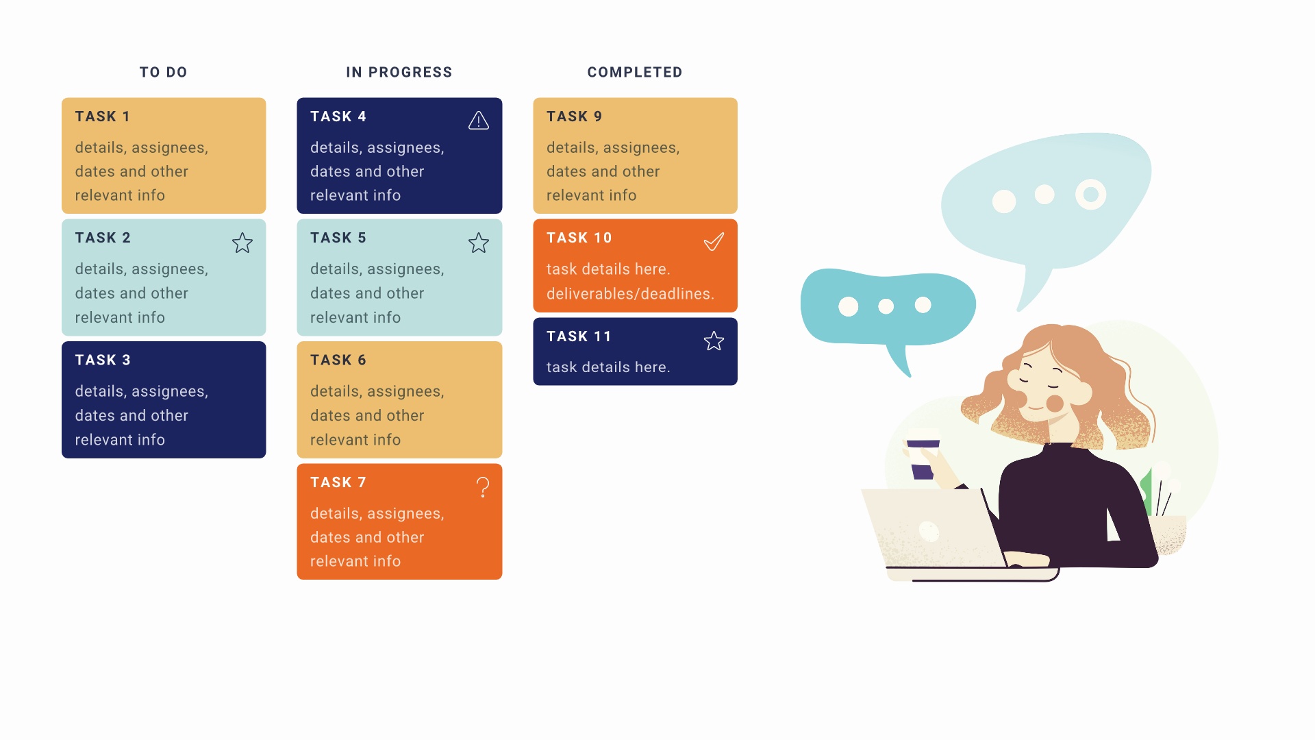 Many companies and organizations use a kanban board (also called a kanban system, or simply kanban) to visualize tasks and manage workflows. In a kanban board, each “card” represents a task, which can be organized and moved around based on their current progress. Columns indicate stages of progress, such as brainstorming, production, testing, or completed.
