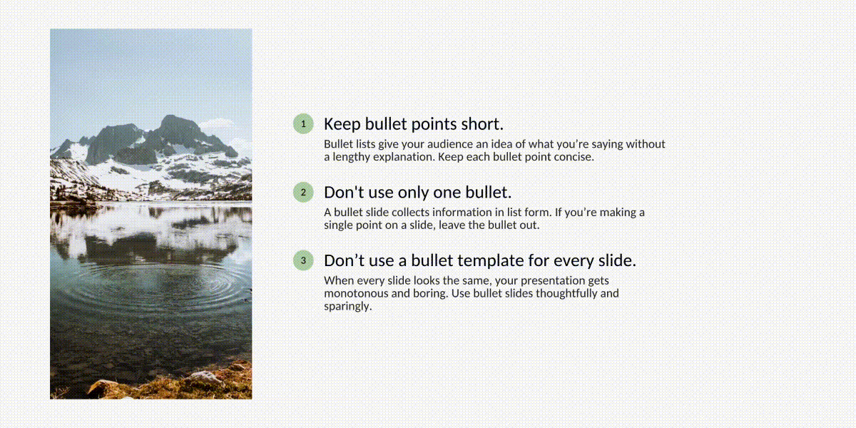 Mix things up with different style options! Now you can add numbers or icons (or images) to your sections to call-out important takeaways or bring attention to your slide, and choose different background colors from the new color menu. This update is great for various use cases like representing your marketing funnel graphically with icons.
