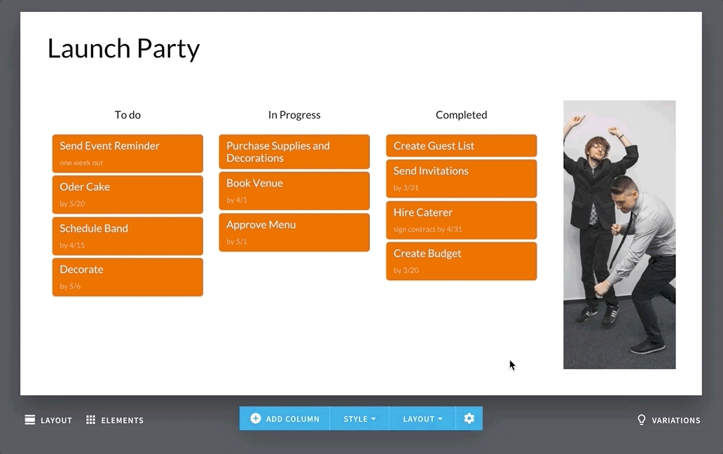 Many companies and organizations use a kanban board (also called a kanban system, or simply kanban) to visualize tasks and manage workflows. In a kanban board, each “card” represents a task, which can be organized and moved around based on their current progress. Columns indicate stages of progress, such as brainstorming, production, testing, or completed.