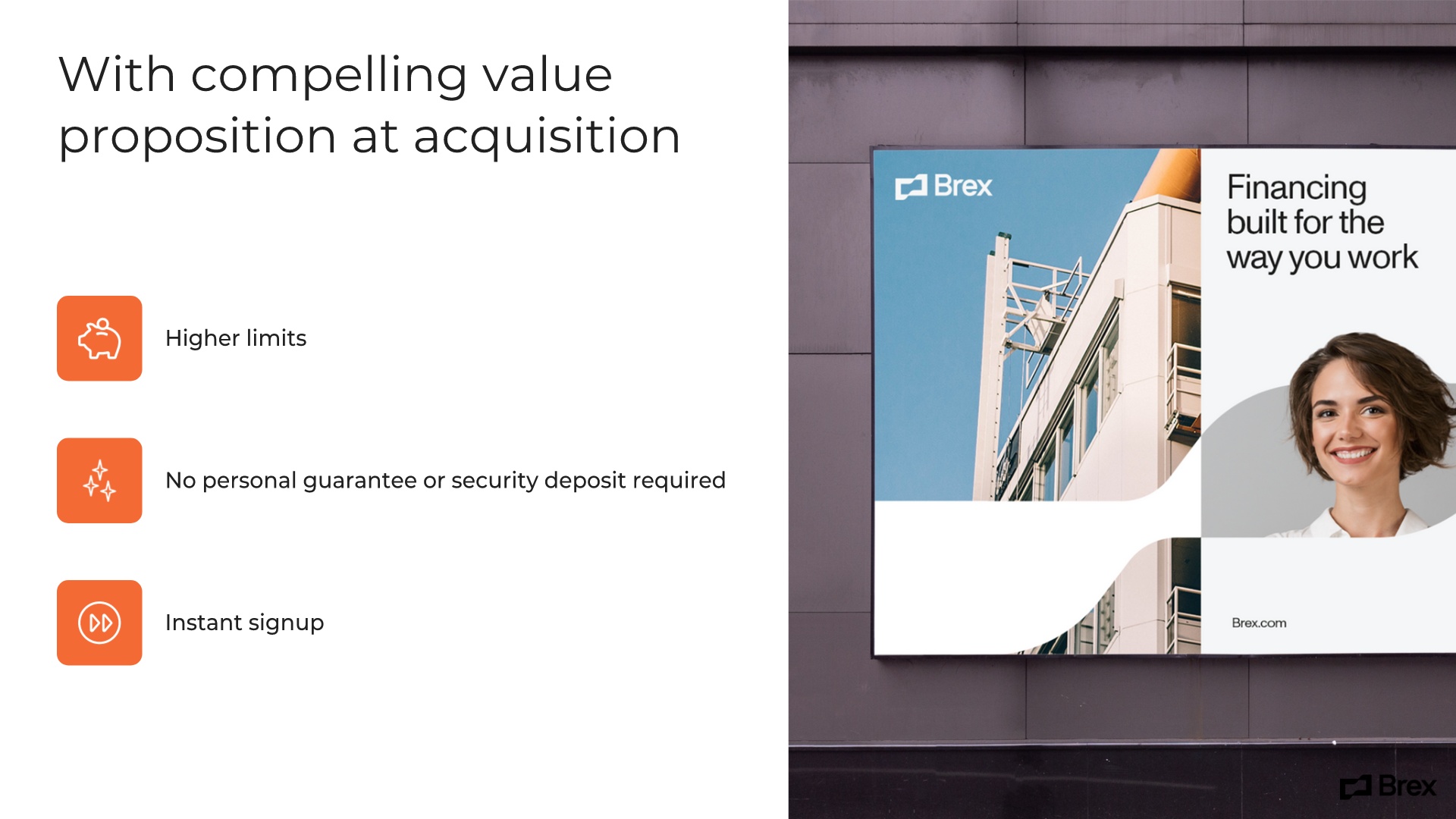 Brex used its next slide to illustrate its value proposition at acquisition using simple illustrations against a white background. We decided to jazz up this slide in our PowerPoint makeover by using our Icons with Text template and adding a colorful photo from our vast library of free stock images.