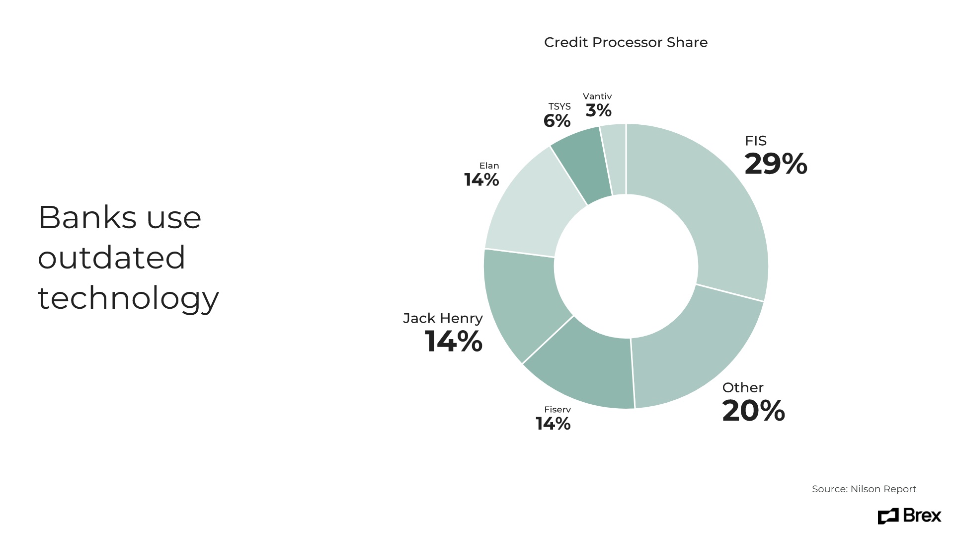 The next two slides in the original Brex pitch deck identified problems in the then-current market. Entrepreneurs couldn’t get credit cards, banks use outdated technology, and corporate cards lack controls. We recreated these slides by adding a twist of extra engagement and illustrating the points with infographics. We selected Beautiful.ai’s Flow Chart and Pie Chart templates, added some basic data and let the AI do the rest.