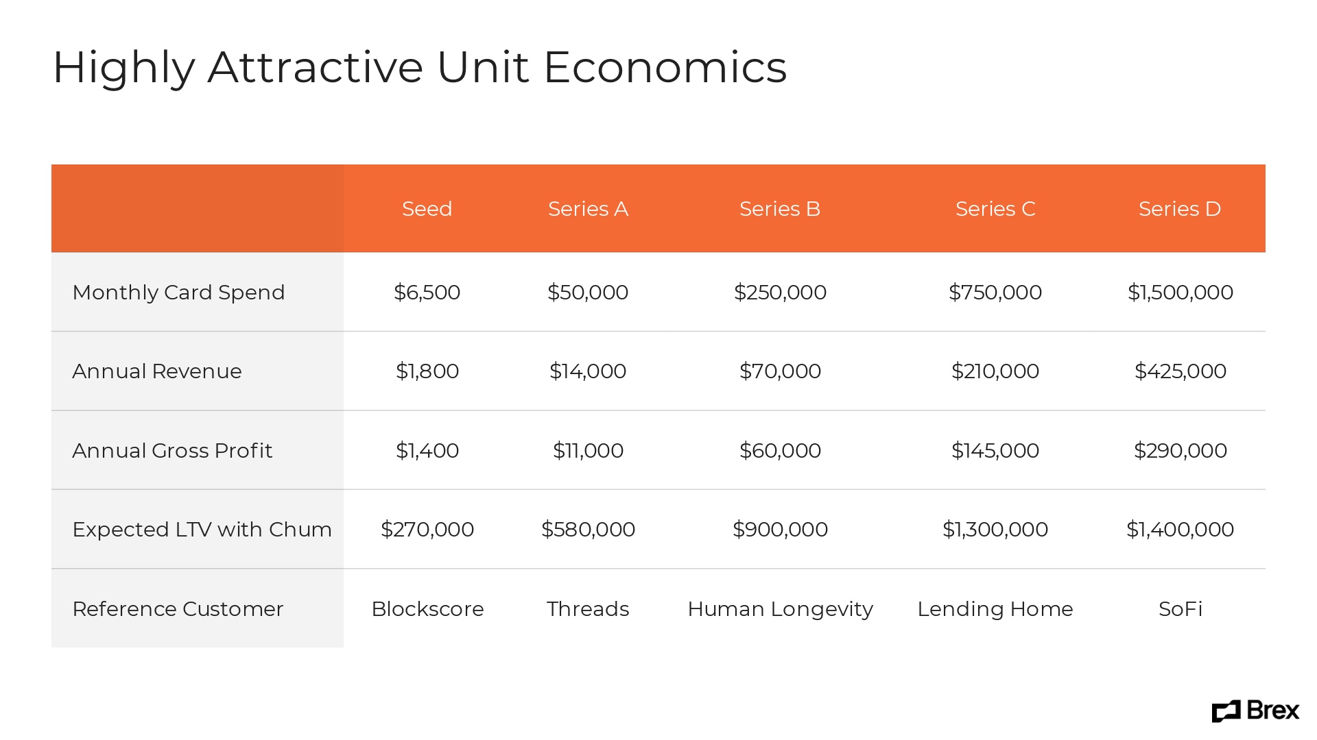 Brex presented an informative chart highlighting the company’s economics on its next slide. Creating a similar chart was simple using Beautiful.ai. We chose our Table Smart Slide template and started entering data. We let the AI handle the rest!