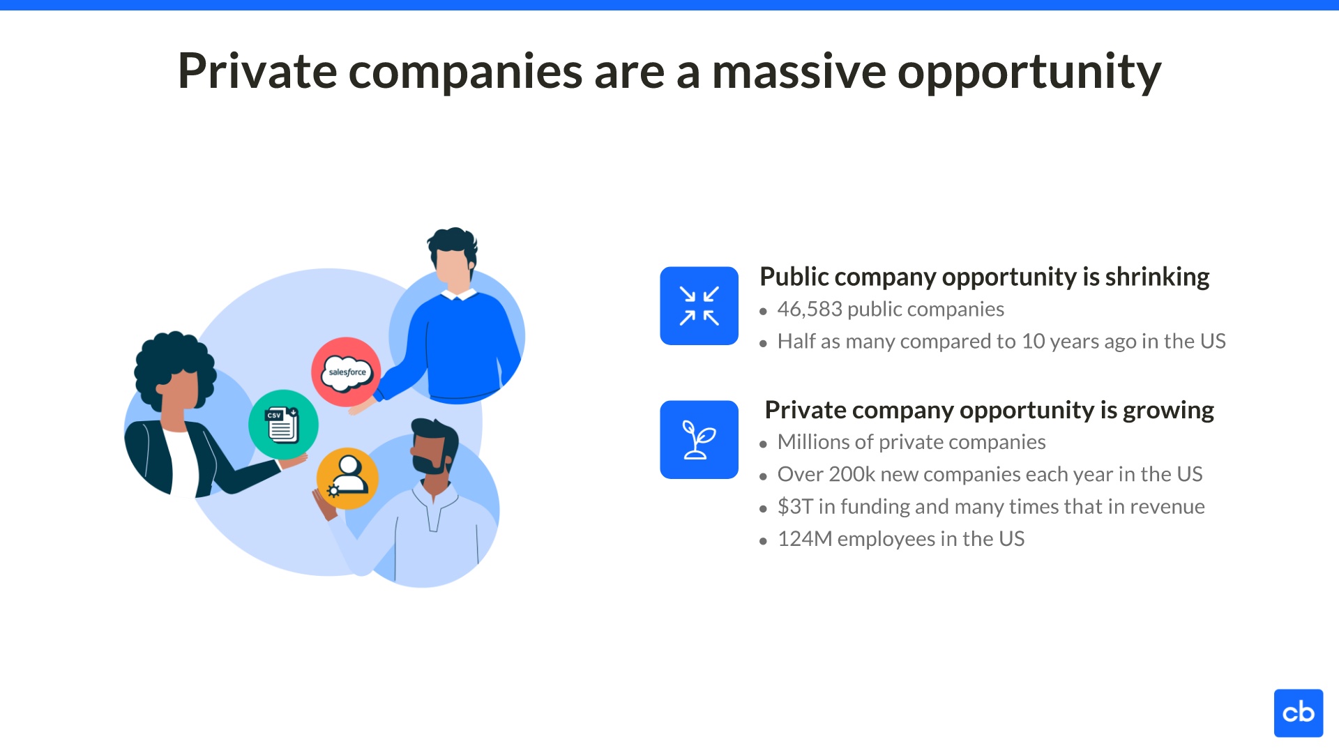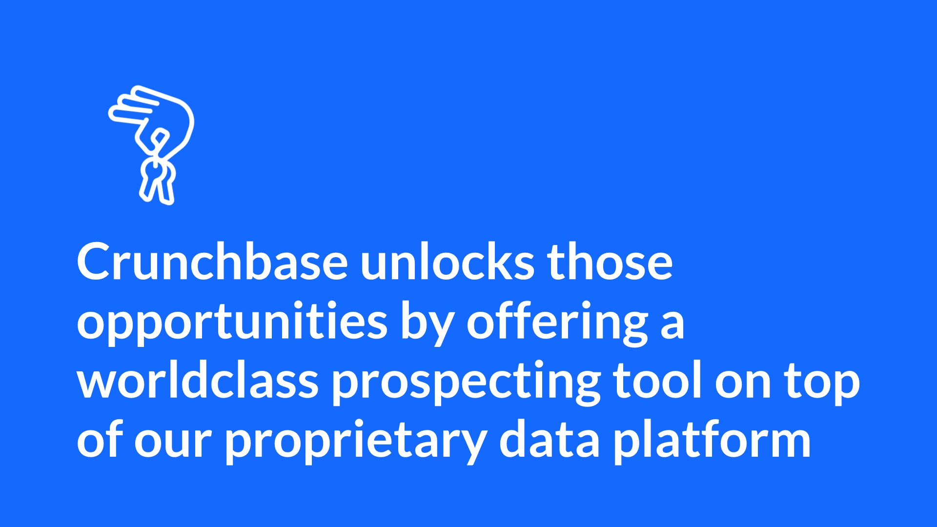 The next slide in the Crunchbase 2019 pitch deck discusses opportunities in the market, and it lays the foundation for a Crunchbase solution. We redesigned this slide using a similar image to the title, establishing a visual theme for the deck. We then animated a series of bullet points to illustrate the pertinent information and engage viewers.