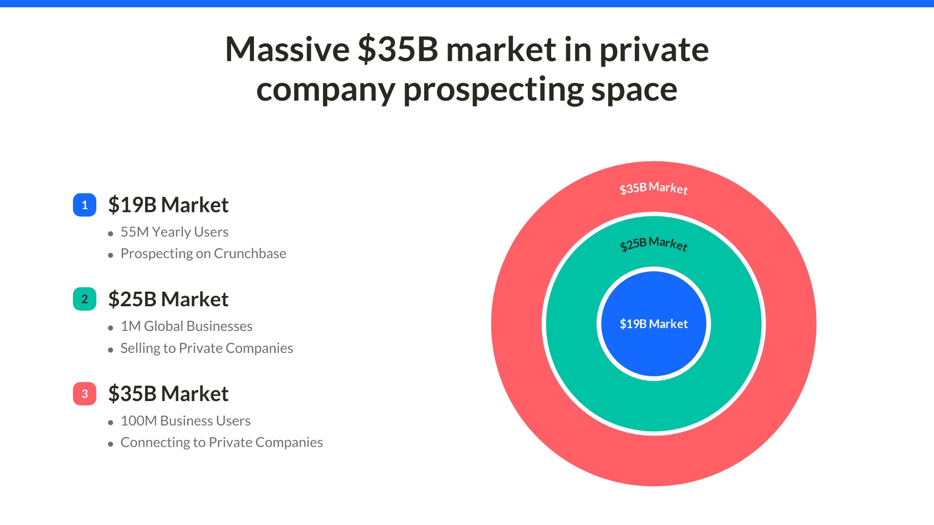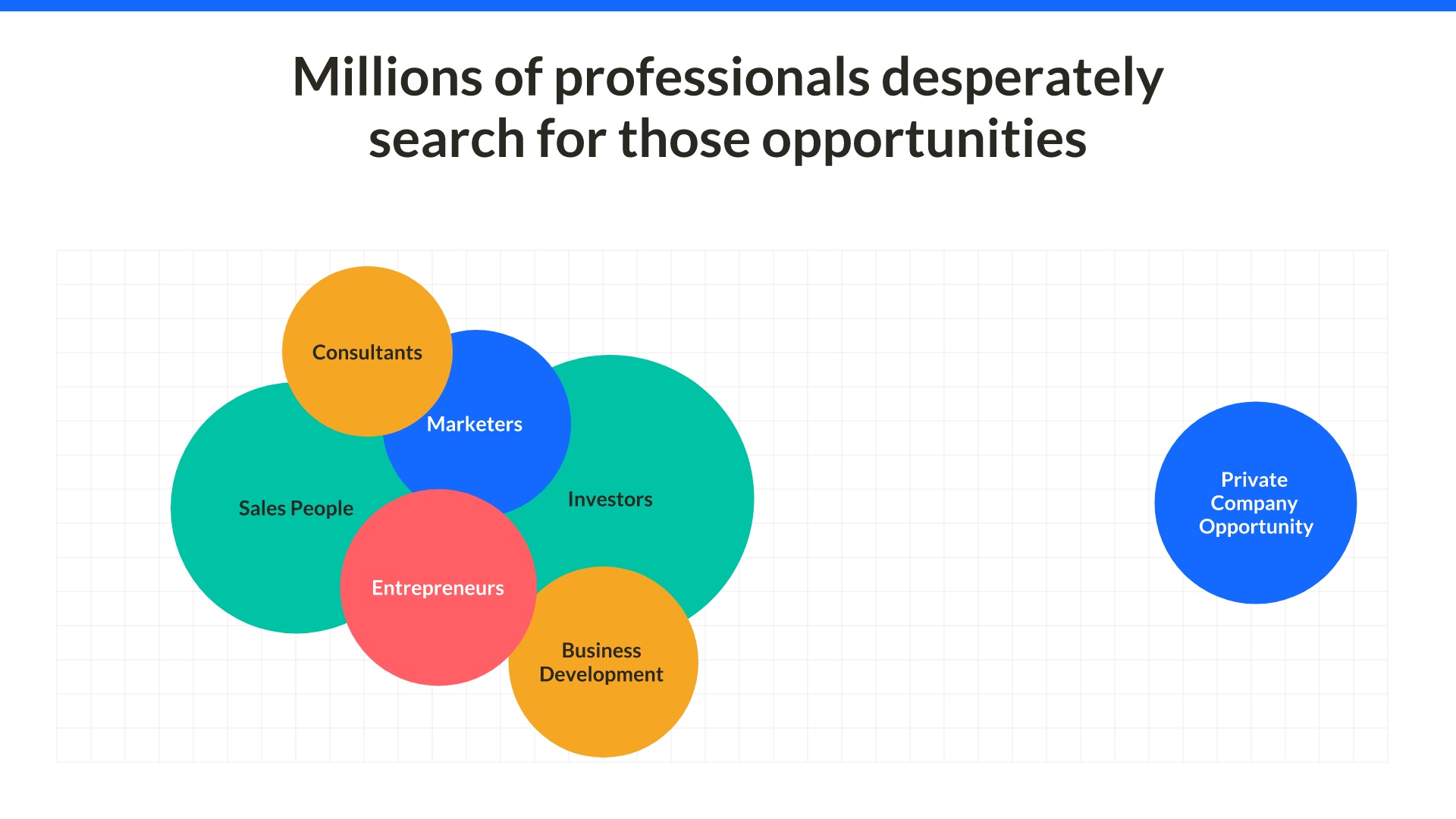 In its next 2019 pitch deck slide, Crunchbase highlighted the millions of professionals vying for private company opportunities. Instead of another boring list, we included each of these competing professionals in an XY Plot, which together formed a group to compare to the isolated opportunity on the opposite side. Creating the slide was simple since Beautiful.ai’s special brand of artificial intelligence adjusted the design each time new content was added, ensuring the final result adhered to the professional principles of good design.