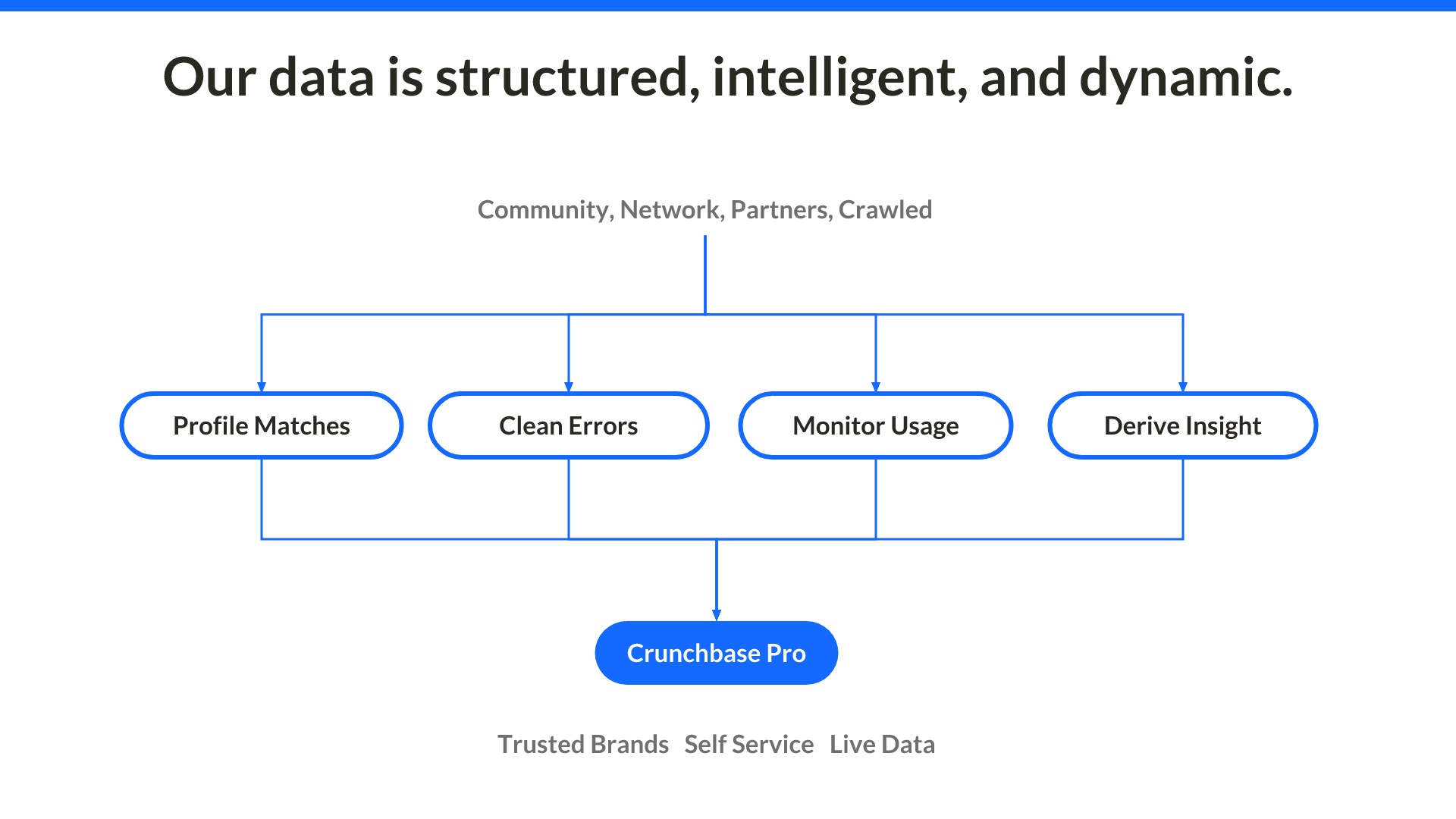 Crunchbase’s next slide in its 2019 pitch deck wasn’t our favorite. The company highlighted the challenges professionals face when prospecting opportunities with yet another boring bulleted list. We brought this content to life in our PowerPoint makeover by illustrating the information with a series of engaging and colorful logos in a Flowchart. We then animated the slide to recapture viewers’ attention.