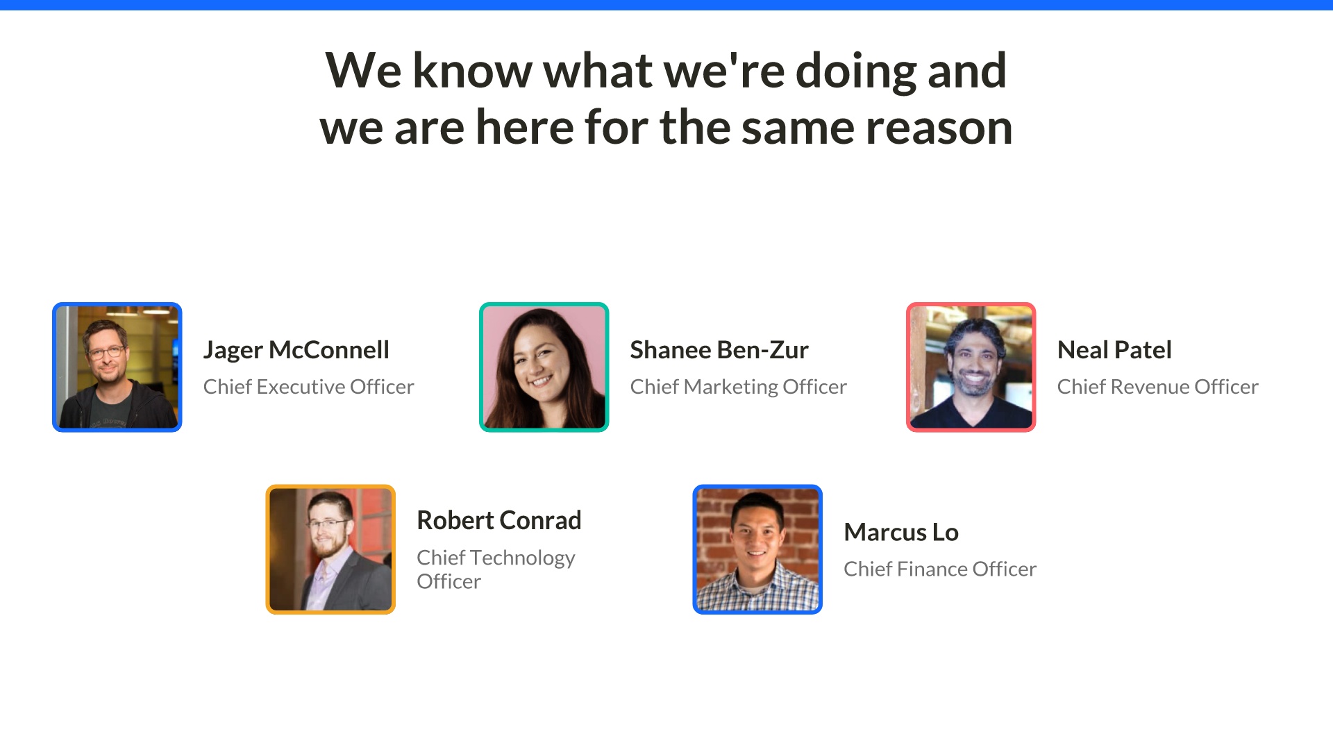 Every professional pitch deck should introduce the company’s principal players to potential investors. The Crunchbase 2019 pitch deck was no exception, but we honestly felt like it overloaded viewers with too much information in a single slide. We simplified the slide and recreated the team presentation with our Team Smart Slide template, perfectly created for just such scenarios. We then engaged viewers and recaptured their attention by animating the appearance of the slide.