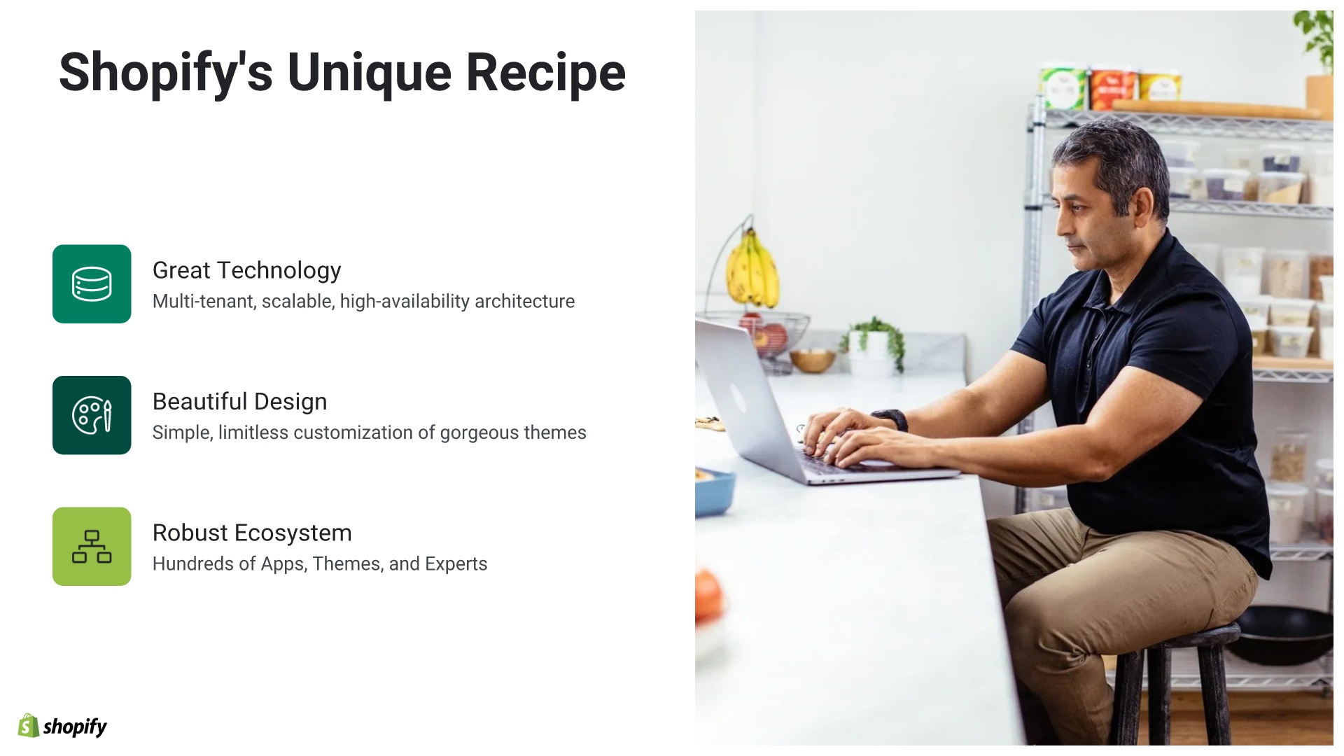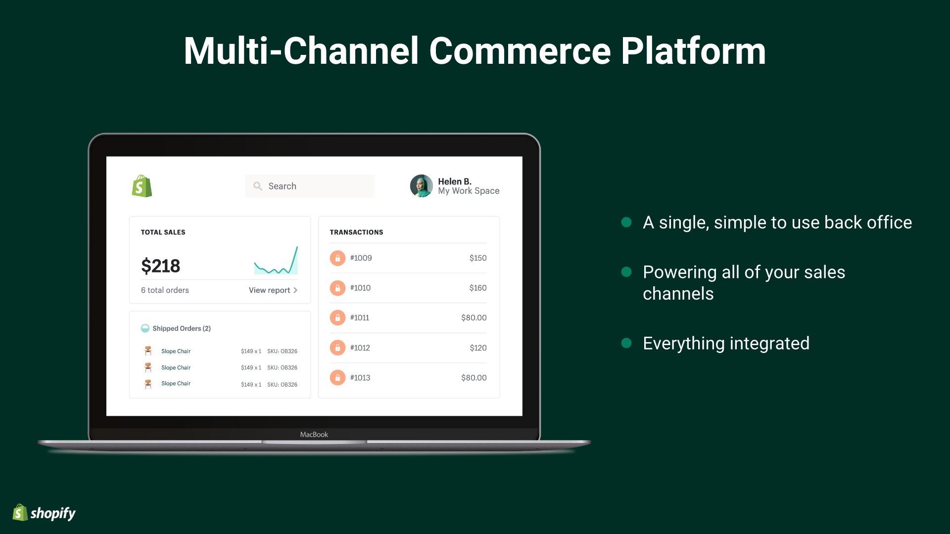 Shopify is a multi-channel commerce platform, and the next slide in the original pitch deck illustrates that point. We redesigned this important slide using our Product Screenshot Smart Slide template against a deep green background. Inside the frame, we placed additional data to help cement the message.
