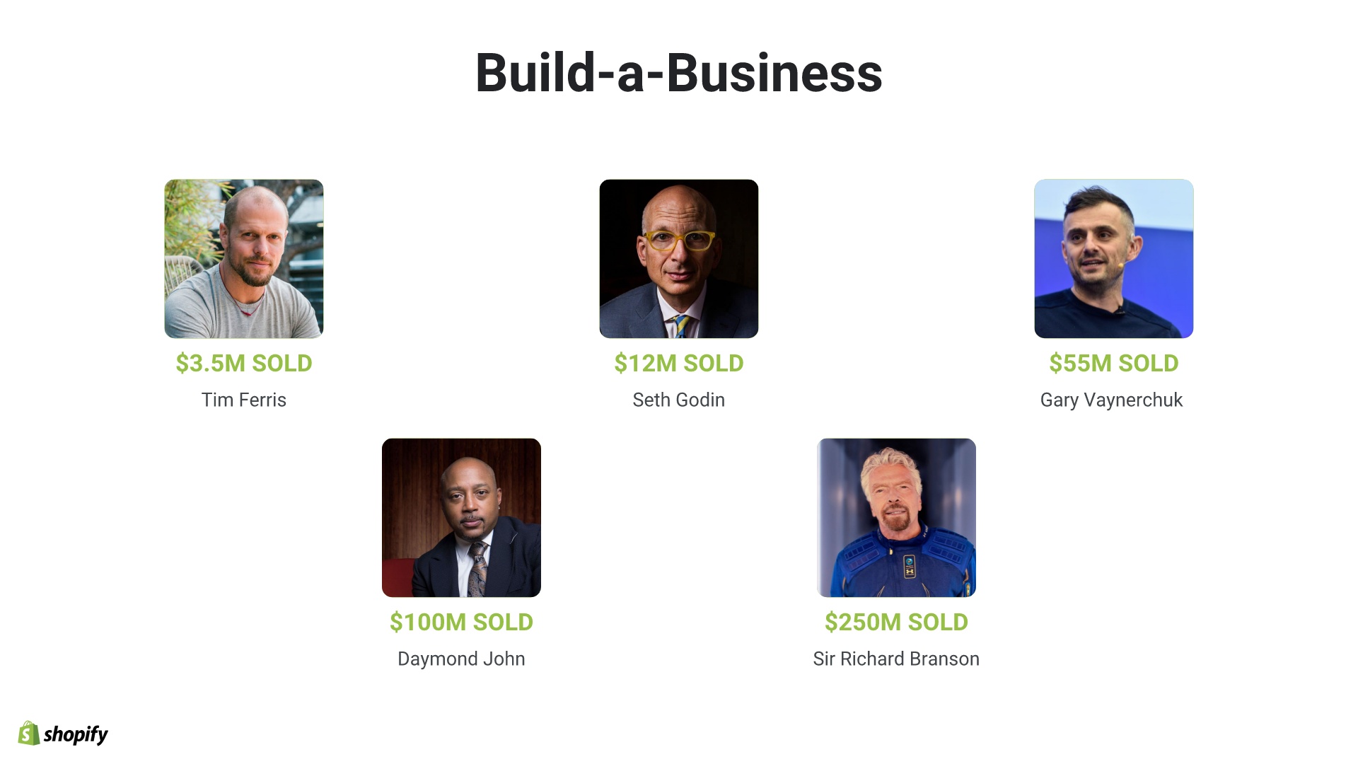 Who uses Shopify? The next slide in Shopify’s original pitch deck features five ultra-successful entrepreneurs and business people who have sold millions using the platform. We recreated this slide using Beautiful.ai’s Icons with Text Smart Slide template, then inserted photos of the entrepreneurs that we pulled from our free library of stock images. Designing the slide was a breeze: Each time we added content, we watched as AI adjusted the slide based on the principles of good design.
