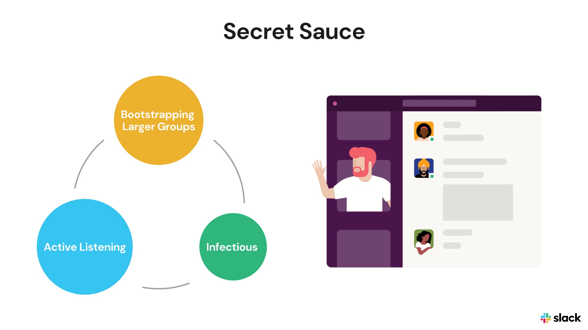 The original Slack deck’s next slide featured what the designer called the company’s “secret sauce,” in which it highlighted the business’s primary selling points. Great information, but the design could have put audiences to sleep in an actual pitch meeting. Instead of another boring list, we engaged audiences and transformed the content into an infographic by placing the terms into our Cycle Smart Slide template. We further captured viewers’ attention with movement by animating the infographic.