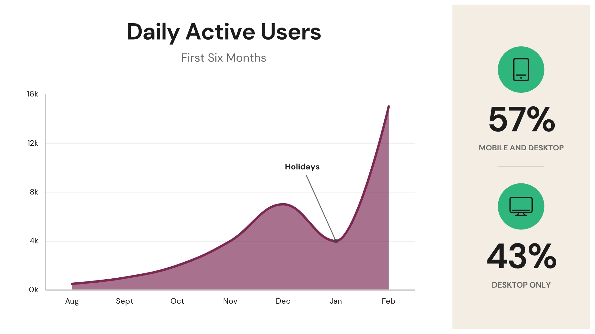 We couldn’t just recreate the original Slack deck slide for slide. To truly make the deck what we could consider “beautiful,” we needed to add some extra engagement, and we did so in the form of an informative infographic. Using our Line Graph Smart Slide template, we charted Slack’s daily active users over the company’s first six months. Designing infographics is simple with Beautiful.ai. Just choose the best template, input your data and watch as AI designs a perfectly proportioned data visualization, including popular choices like bar graphs and pie charts.