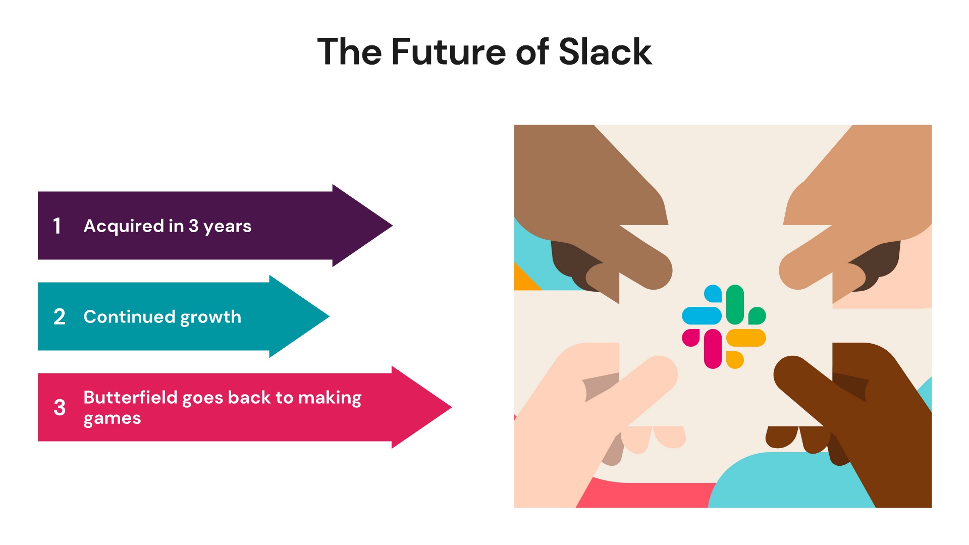 The original Slack deck featured a large graphic of the company’s logo atop a white background for its title slide. We gave the slide the Beautiful.ai treatment and transformed it into an engaging introduction with our Headline Smart Slide template. The slide features a bold purple background and an image of hands reaching across the logo, both from our library of free stock images.