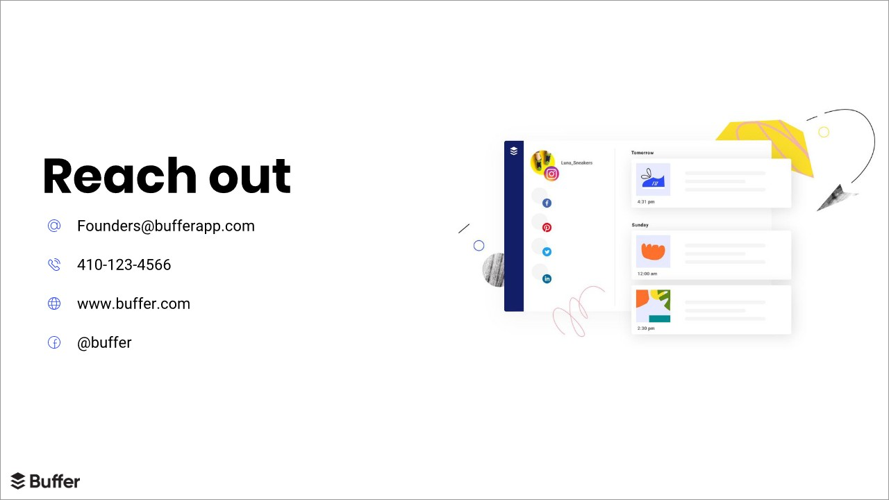 Buffer’s original pitch deck included a final slide that couldn’t be more short and sweet: the company email address. We spiced up the slide using Beautiful.ai’s smart template by again inserting Buffer’s logo along with an animated list of primary contact information.
