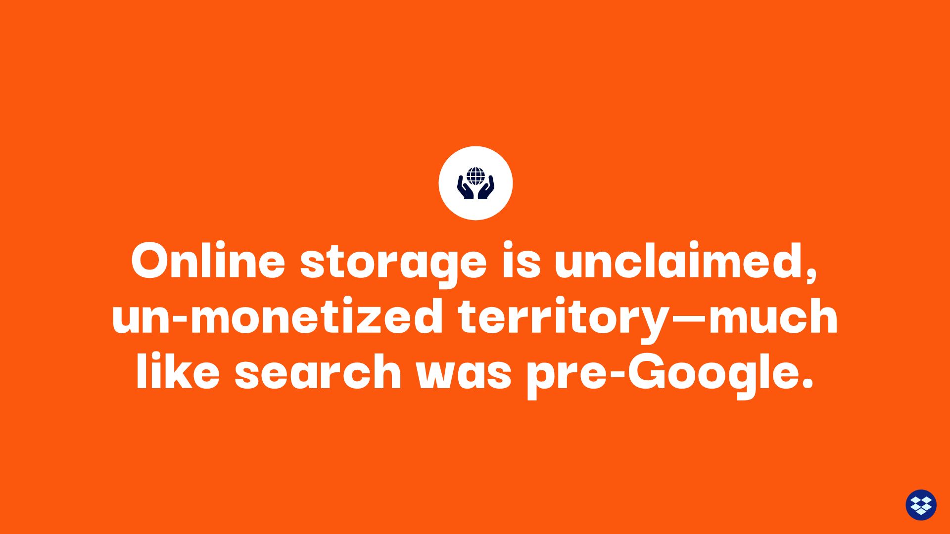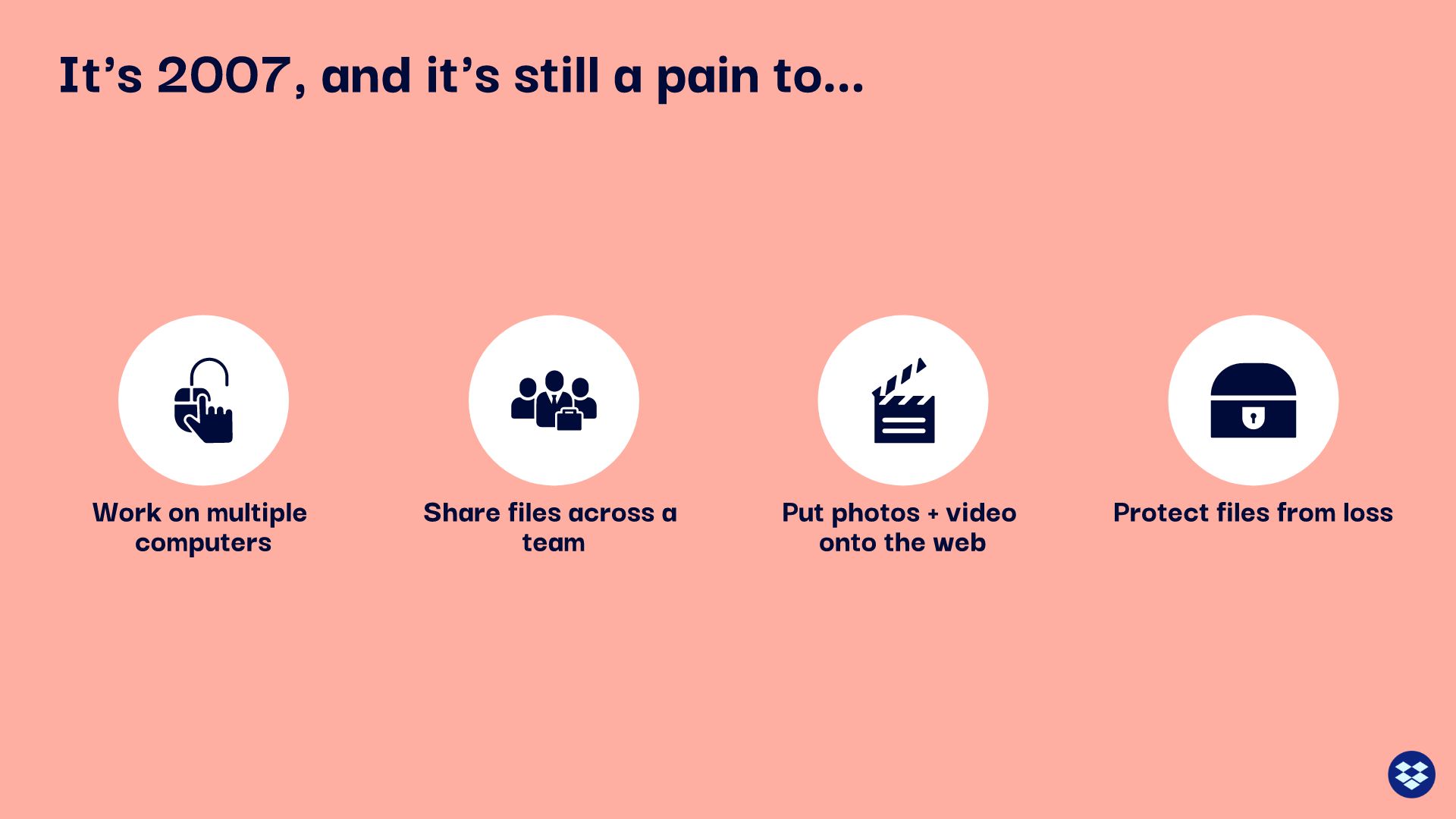 So, what were people doing to address storage issues in 2007? The answer is featured in the next slide. Again, we replaced Dropbox’s original— and boring— bulleted list with a series of icons that describe each option.
