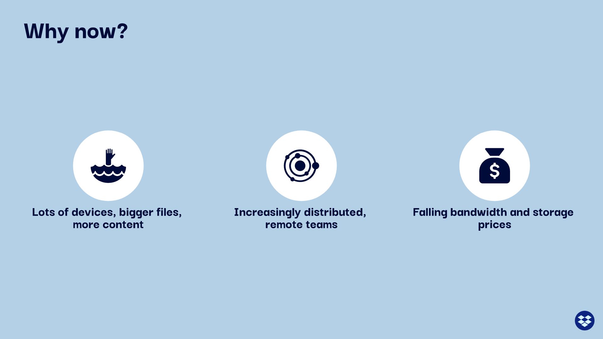 Timing is important in the release of any successful product. The Dropbox team believed they were launching their company at a pivotal time and explained why in the next slide. Unfortunately, they relied on the same boring bulleted list they used for the previous slides. It makes you wonder how many investors were asleep at this point of the presentation.