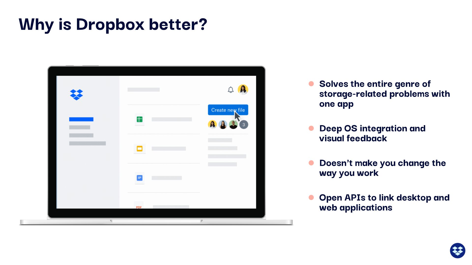 Any effective pitch deck will tell potential investors why the product is better than its competition. And— surprise, surprise— Dropbox delivered its explanation in yet another bulleted list. We also listed these reasons as a bulleted list, but our list is to the side of an animated image that is sure to refocus audiences on the subject at hand.