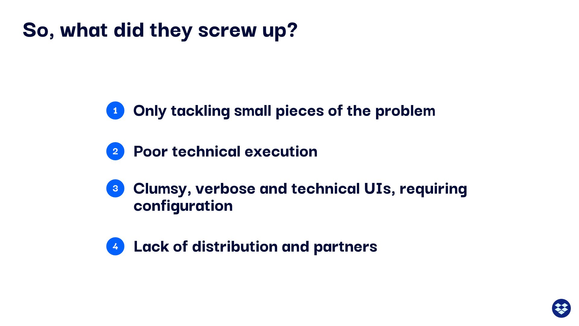 Dropbox further explained the problem on a second slide, and we followed suit in our redesign. Why was storage such a mess in 2007? Dropbox gave four reasons, and while we didn’t feel any reason to change them, (we think) we’ve presented them in a better fashion. Instead of just another boring bulleted list, we listed each of the reasons with a corresponding icon.