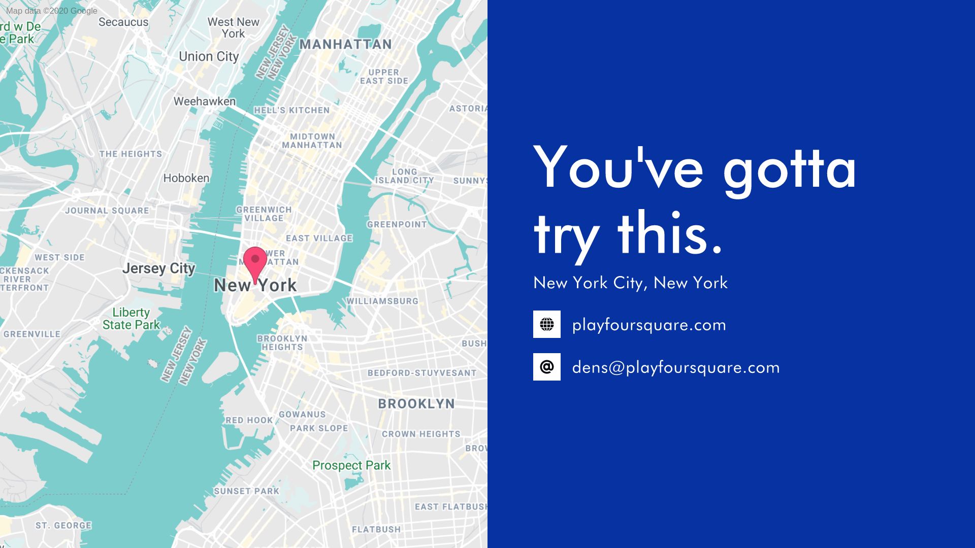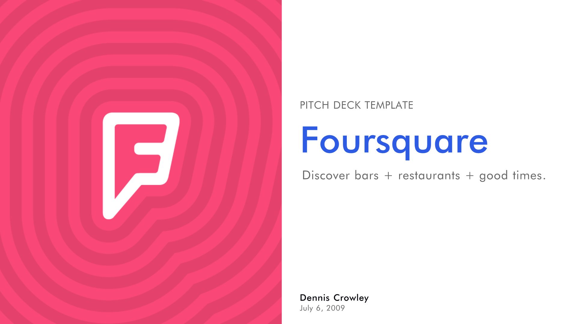 Just like every book needs a cover, every pitch deck needs an introductory slide. We transformed the introduction slide from the original Foursquare pitch deck into this stylish number using our Title slide template, and we incorporated Foursqare’s logo, found in Beautiful.ai’s vast library of logos and free stock images.