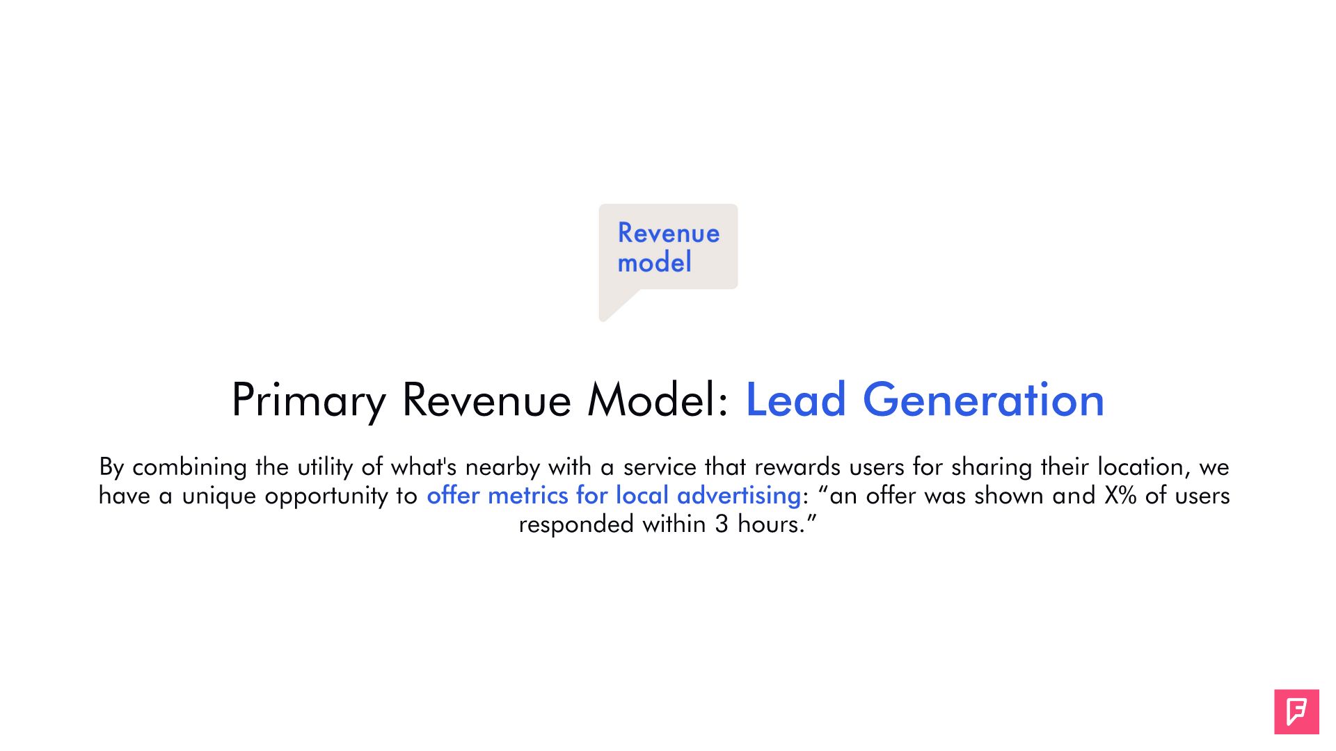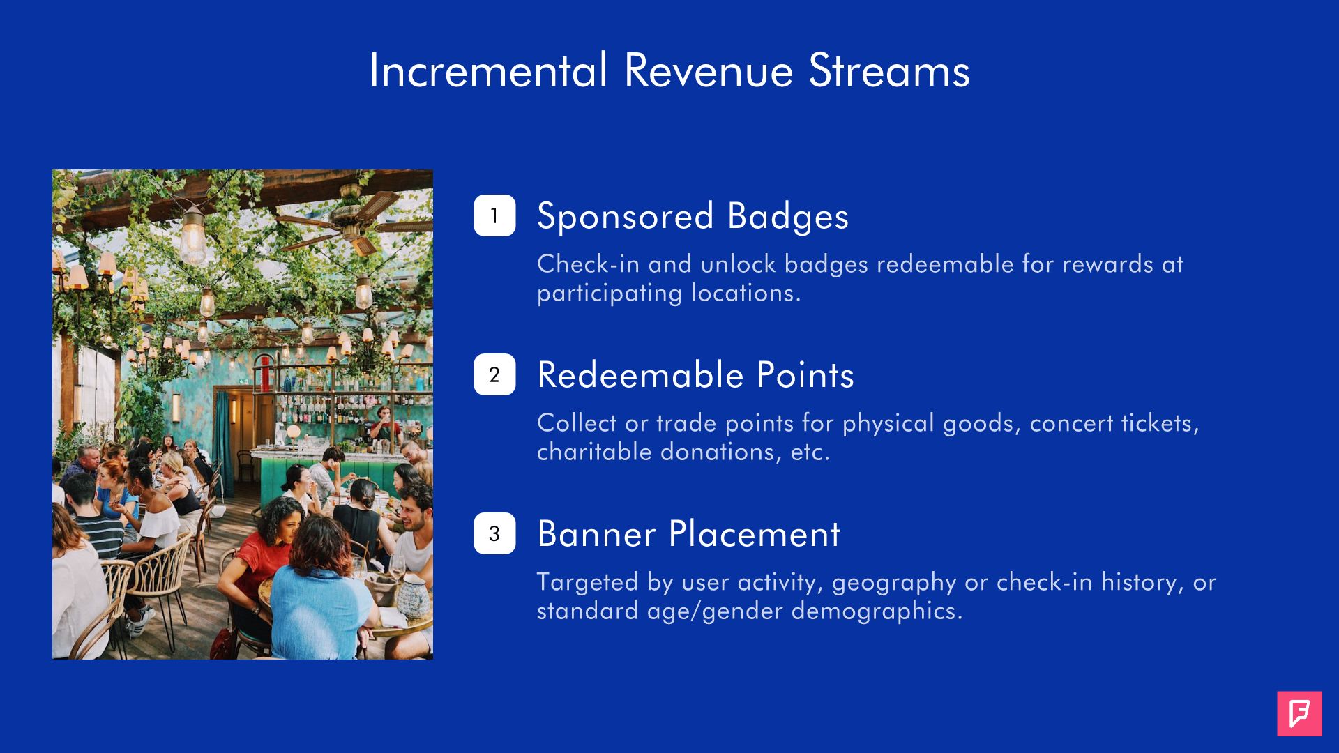 Of course, practically all potential investors ask themselves how they will recoup their money. Foursquare did not disappoint with its original pitch deck, and it dedicated two slides to its revenue model. When we recreated the presentation, we kept the slide illustrating Foursquare’s primary revenue model short and sweet using our Headline smart template. Then, we showcased three additional revenue streams using Beautiful.ai’s Bullet Points slide.