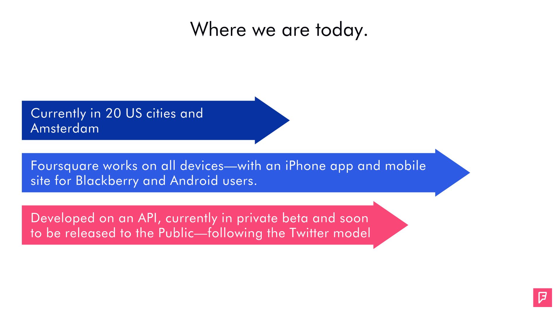 Potential investors are most interested in the meat and potatoes of a presentation. Foursquare’s original pitch deck got straight to the point by answering the question, “What is Foursquare?” We used the next two slides in our redesigned presentation to answer the same question.