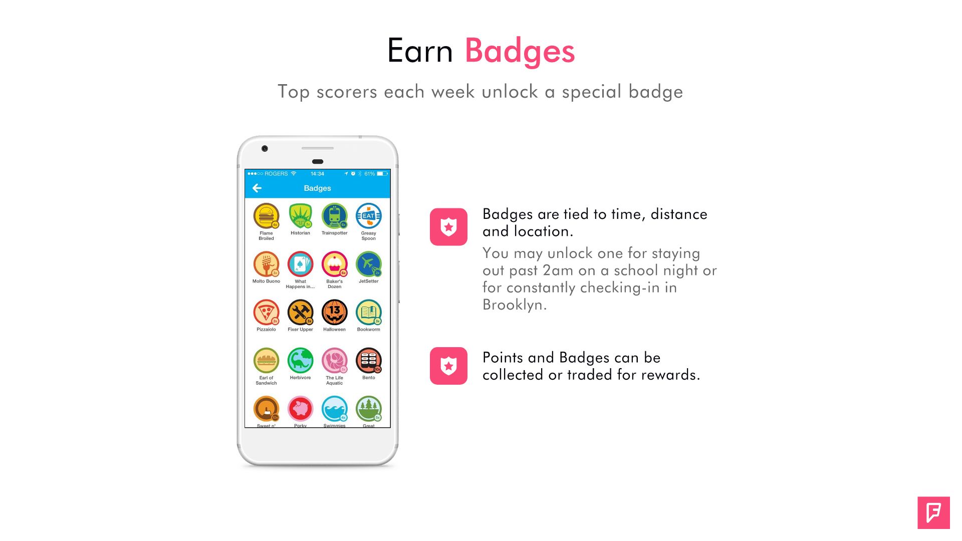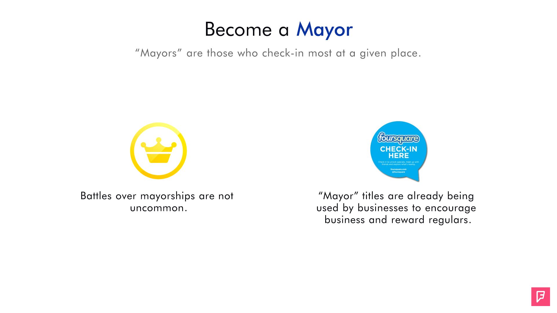 Our next two slides explain Foursquare’s original gamification model. We used our Mobile Screenshot smart slide to illustrate how users earn badges. The template features the outline of a smartphone, and we inserted a screenshot of Foursquare’s various badges. Then we again chose the Icons with Text slide template to explain how a user can become the “mayor” of a location. We added animation to each slide in order to recapture any waning audience attention.