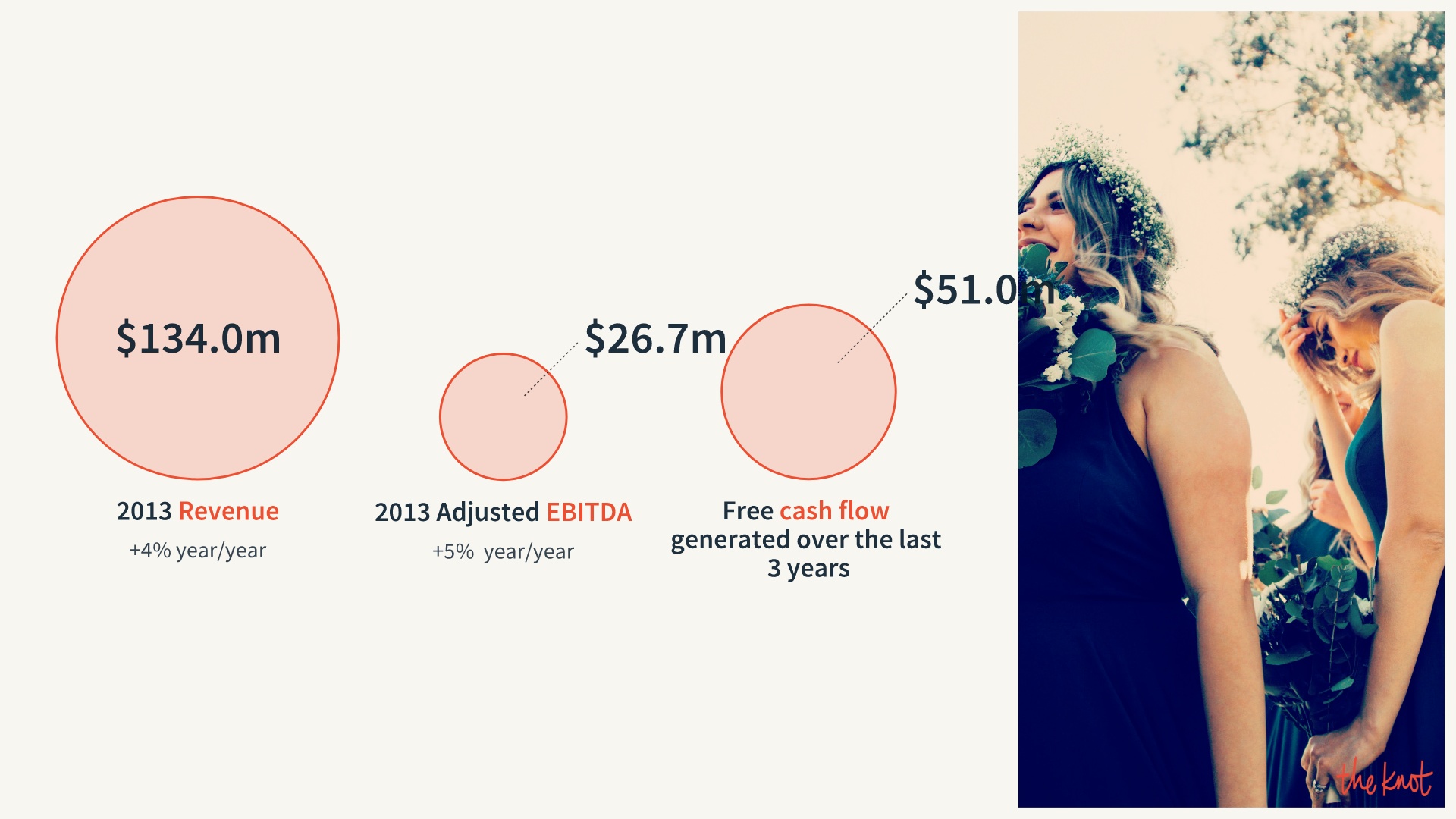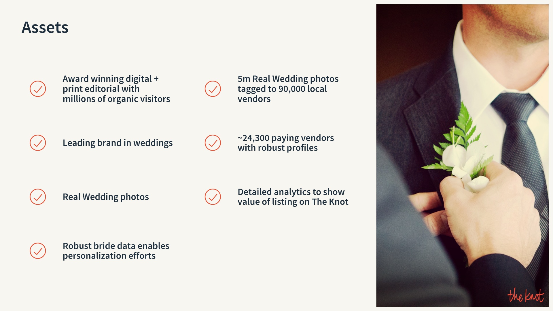 The Knot’s next slide highlighted the company’s 2014 assets, but it presented the information using some plain and boring text boxes. We spiced up the redesigned version of the slide using our icons with text slide template, and we added an accompanying photo to keep the presentation visual and beautiful.