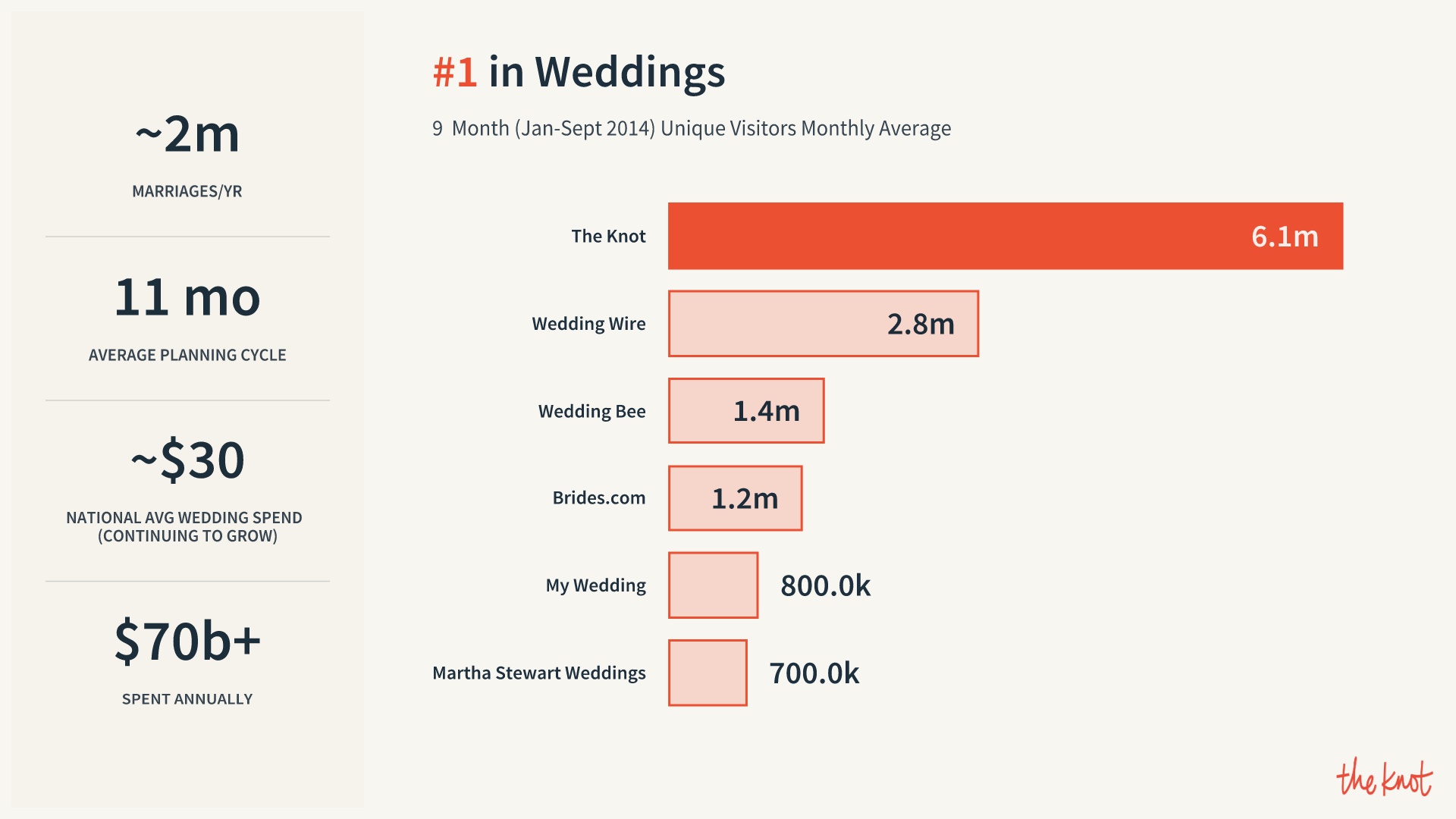 Such was the industry landscape in 1996 when four New York University alum, two of whom had recently experienced the terror of organizing their own wedding, saw a business opportunity. They formed a company to offer online content to help couples planning their weddings, and The Knot, Inc.—now known as The Knot Worldwide— was born. After inspiring AOL to invest seed money, TheKnot.com launched in 1997.