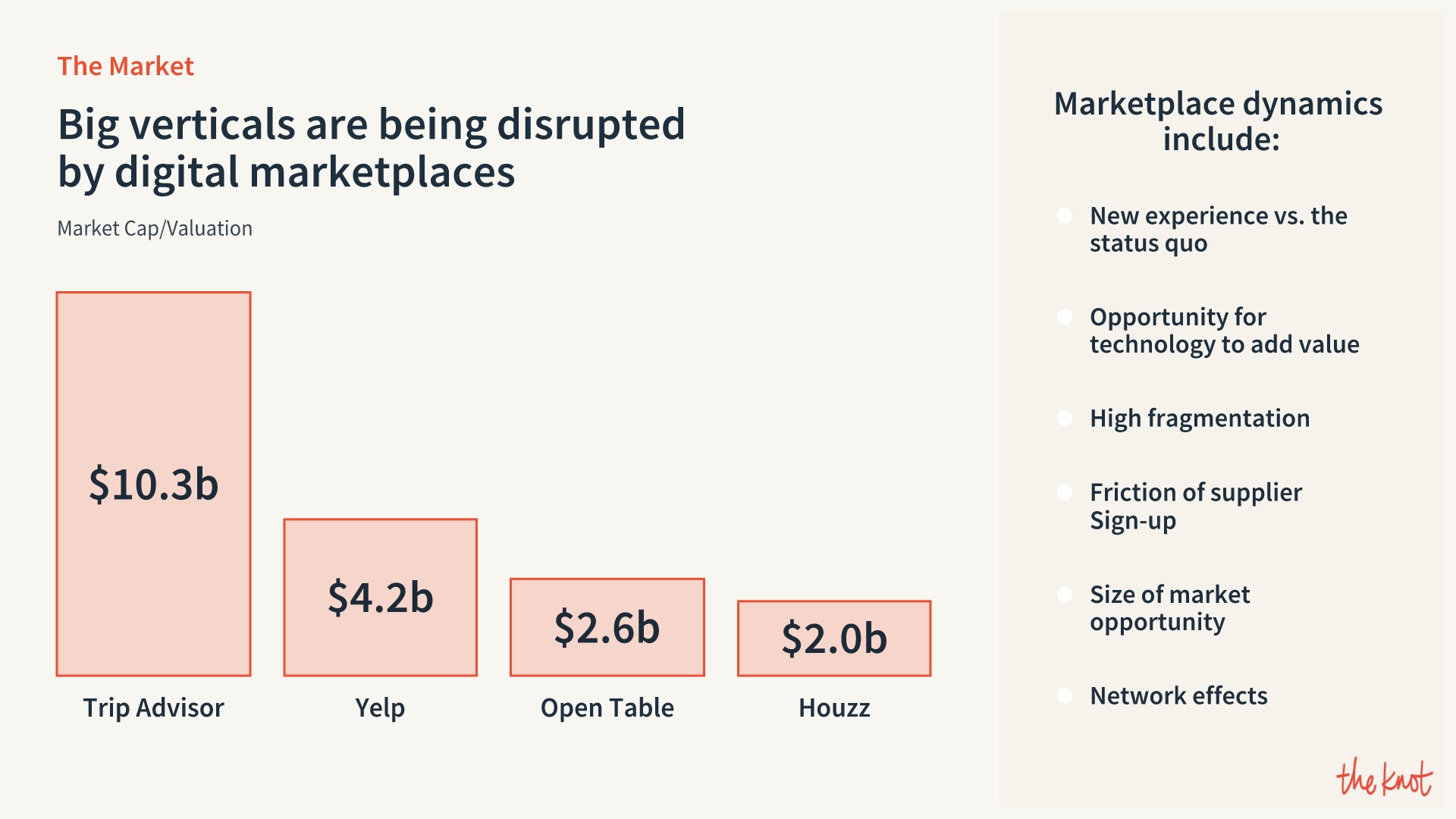 The Knot’s 2014 investor slide deck featured two slides detailing the digital marketplace, and we have to say the first one was a snoozefest. It contained entirely too much data for an audience to consume in a visual presentation format. Using Beautiful.ai’s compare columns smart slide template, we recreated the bar graph on the second slide, and we summarized a few key points on the first into a simple sidebar.