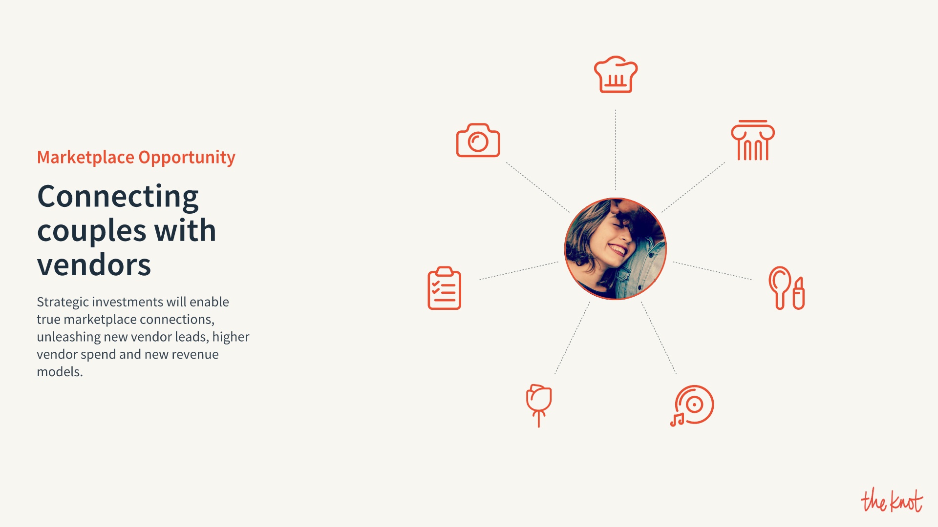 The XO Group repeated the mistake with its next slides, which describe The Knot’s marketplace opportunities. The first of the two slides is crowded and messy with too many details. We summarized the information and presented it using our hub and spoke slide template. The extra data can be presented to the audience in an accompanying addendum.