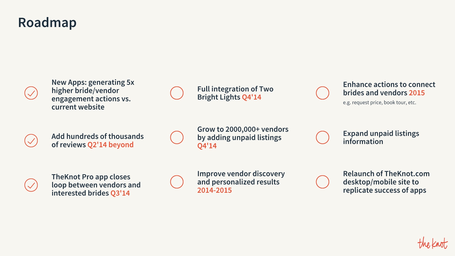 We broke The Knot’s next slide into two, because while details of the company’s future plans were vital to the presentation, it was entirely too much data for a single slide. We summarized the roadmap using our icons with text slide, then we illustrated other details with an infographic using our process diagram slide template.