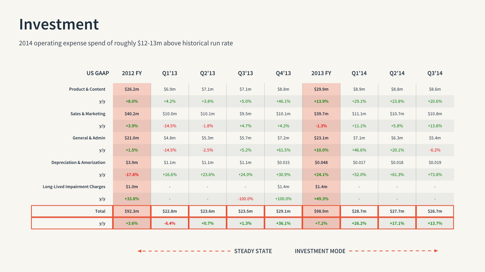 The next two slides in The Knot’s 2014 investor presentation detailed the company’s business investments, and again the company added entirely too much data to each for an effective visual presentation. We consolidated the information into a single slide, and with our table slide template we broke it all down into a single chart, complete with colored columns and outlined rows to emphasize key information.