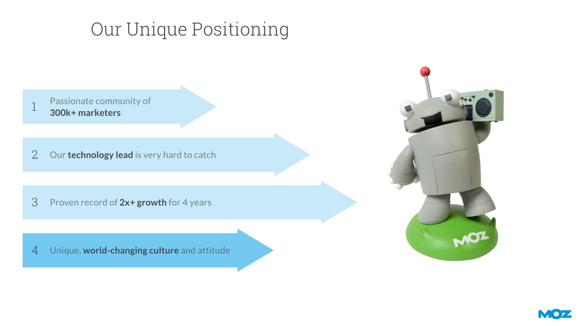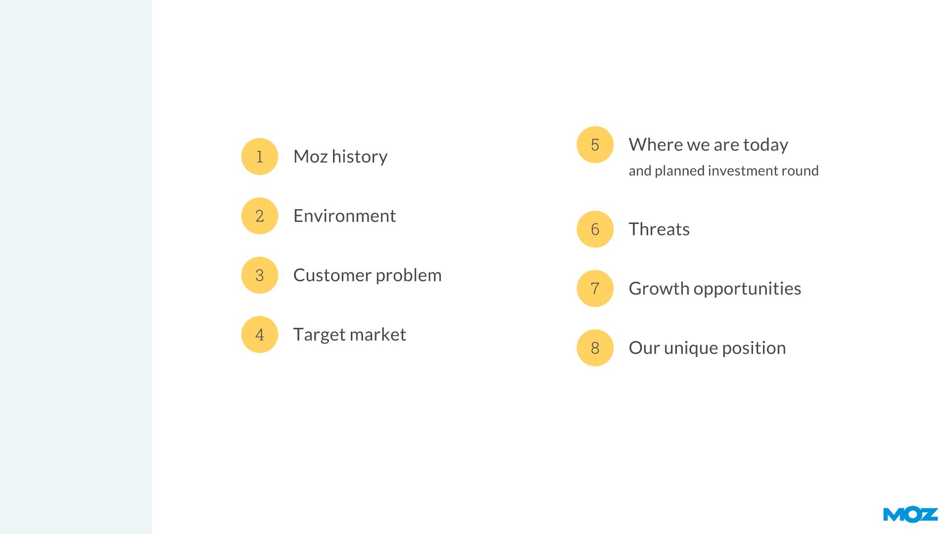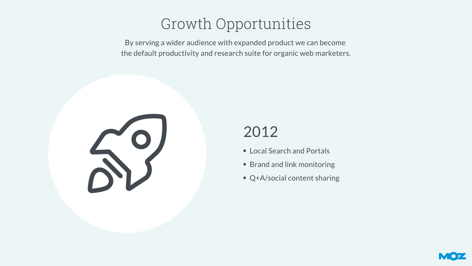 Even though Moz had all the right information to present in that fateful 2011 meeting, it still had to make a pitch— and for that the company needed a pitch deck. We took a look at the original Moz Series B pitch deck, and we think it’s a mixed bag. It’s super informational, but maybe too informational with 36 slides in total. After all, the potential investors already knew about the company.