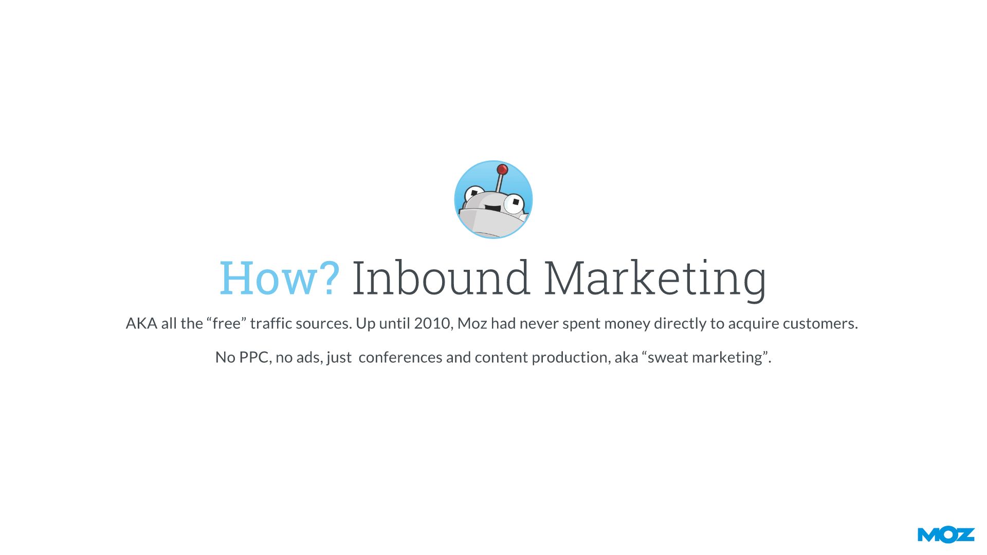 We consolidated the next two slides from Moz’s original presentation into a single page. How had Moz managed its first several years of success? Through inbound marketing, or the “free” web traffic sources. Did that really need to be split between two slides when Beautiful.ai’s headline slide template does the trick? Plus, the design of our made-over slide is more direct and consistent with the rest of the presentation. We added an extra visual element with a Moz logo we found using Beautiful.ai’s free image library.