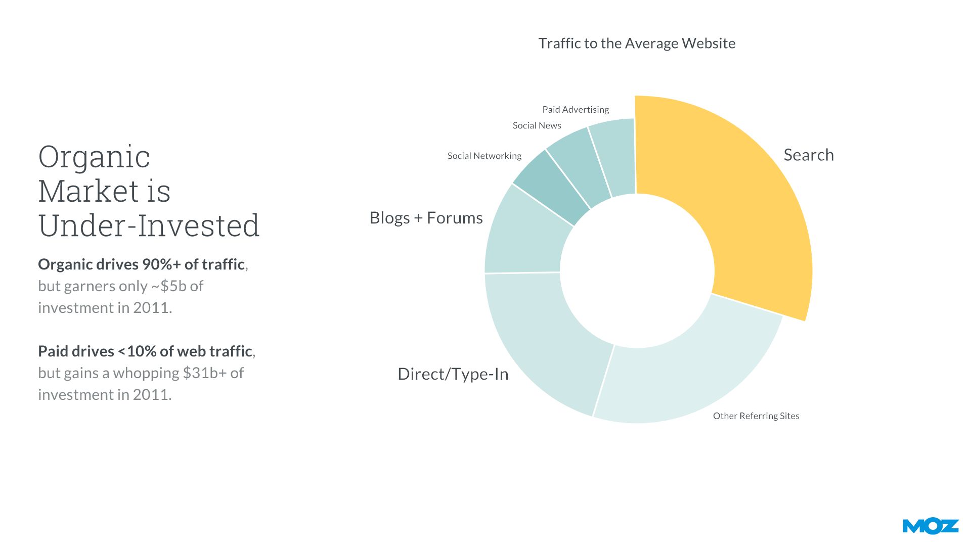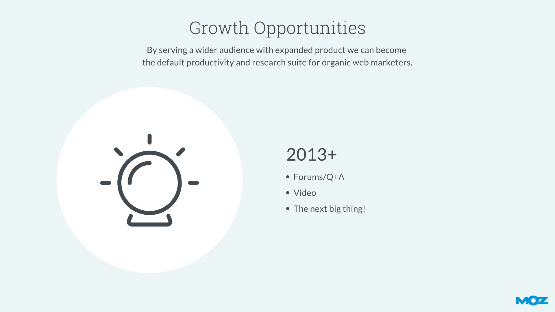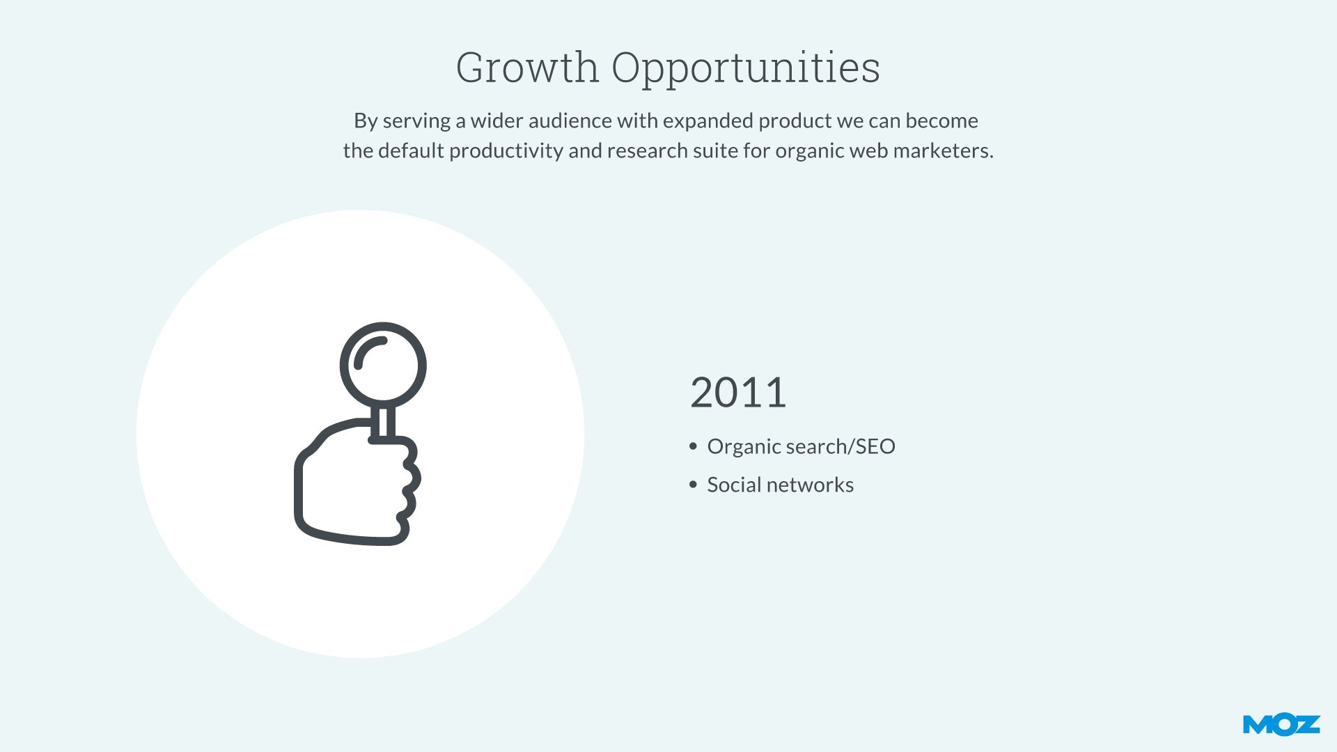 Why was Moz uniquely positioned to win the organic traffic market in 2011? We illustrated each concurrent benefit in our cycle smart slide template. Instead of a numbered, chronological list, we were easily able to add each item into a circular element within the cycle infographic, and we were able to choose corresponding icons from our free image library as each automatically took on the appropriate custom color.