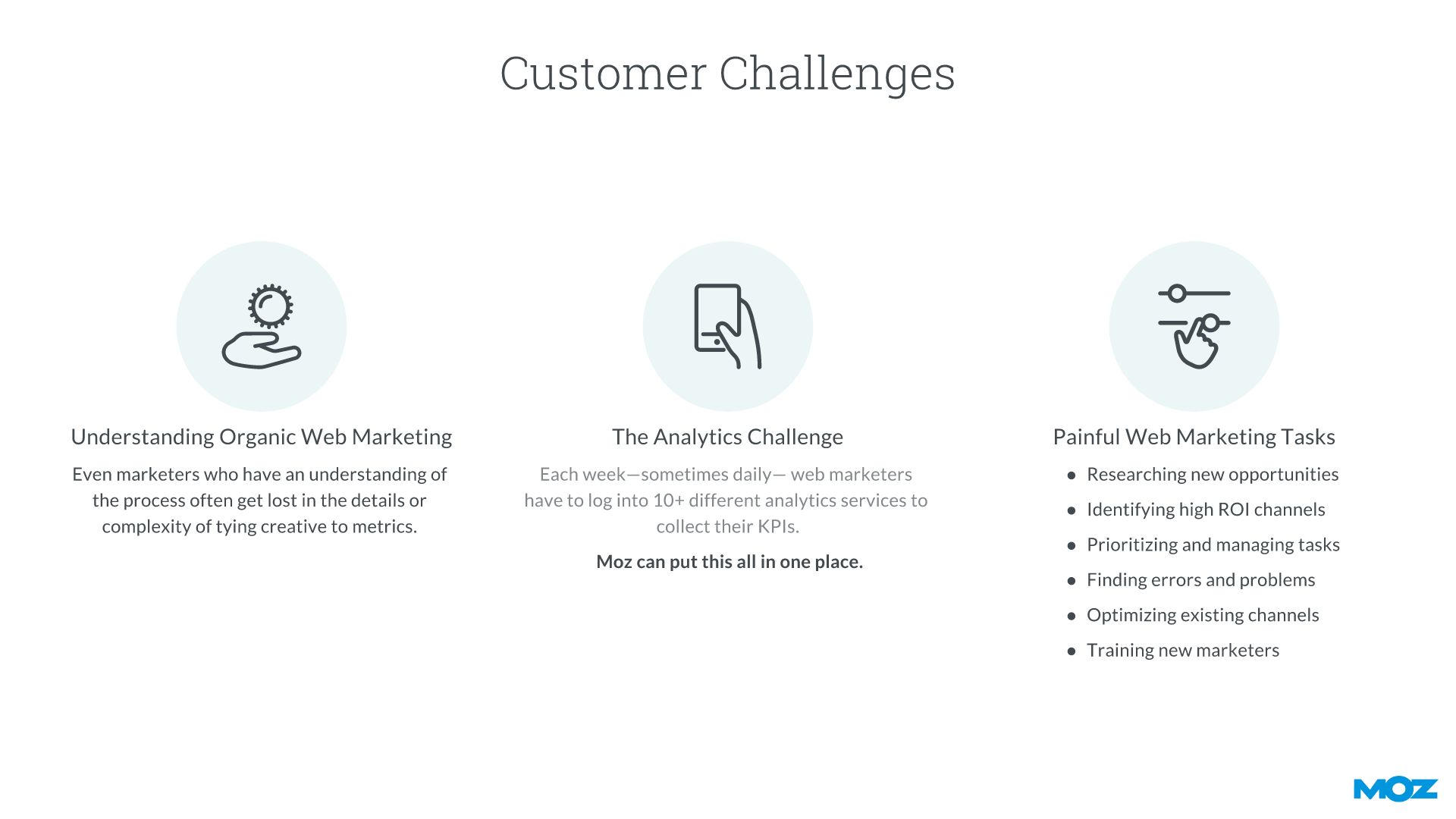 We again chose the icons with text smart template to highlight Moz customer challenges circa 2011. Just like with the previous redesigned slide, we simply selected a free icon from our library for each element, then added the textual content. Creating the slide was a cinch since all the appropriate fonts and colors were preselected from our customized presentation theme. Animating content appearance was merely the icing on the cake of the redesigned slide.