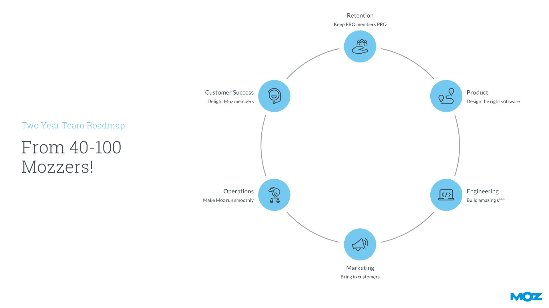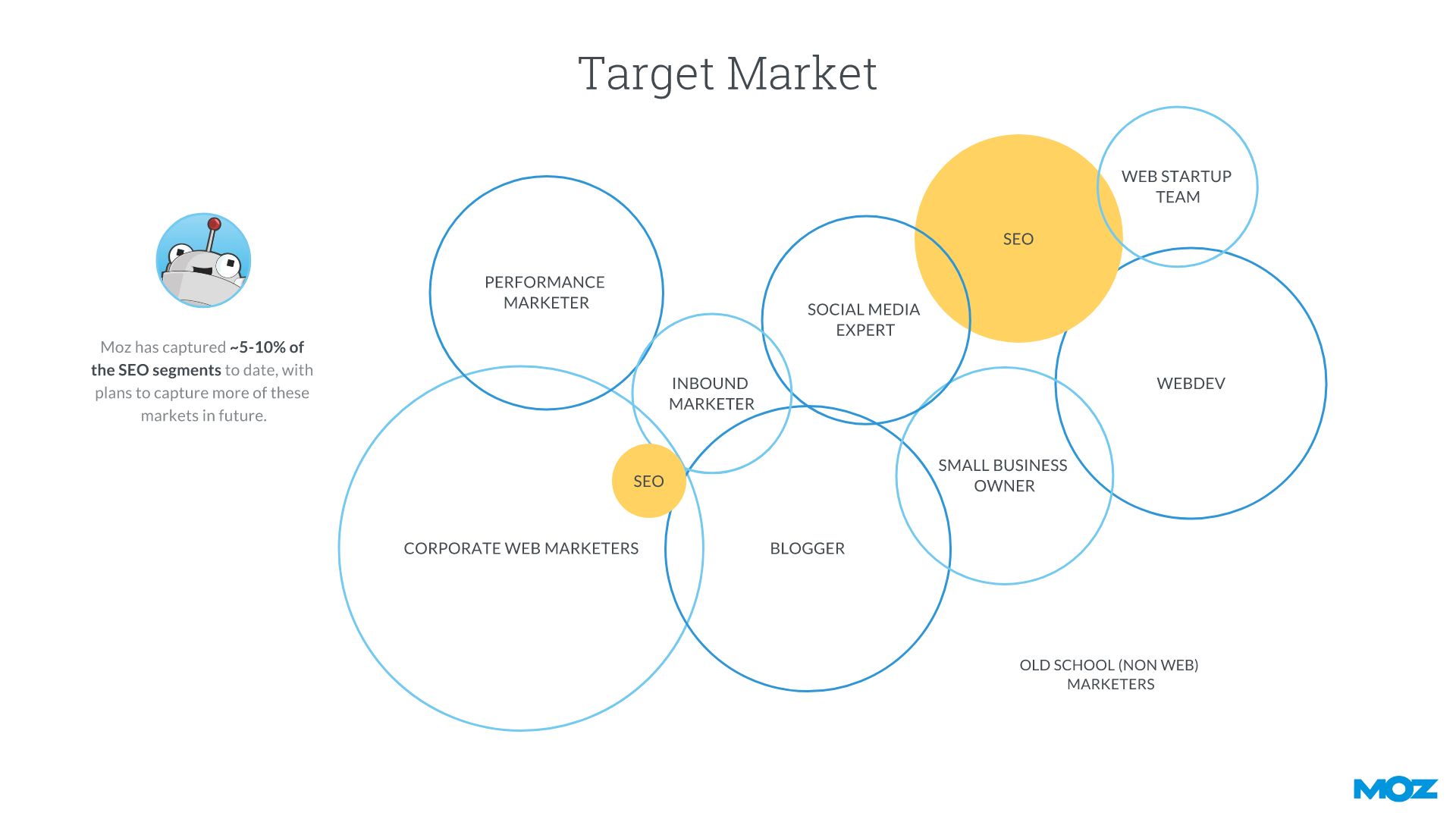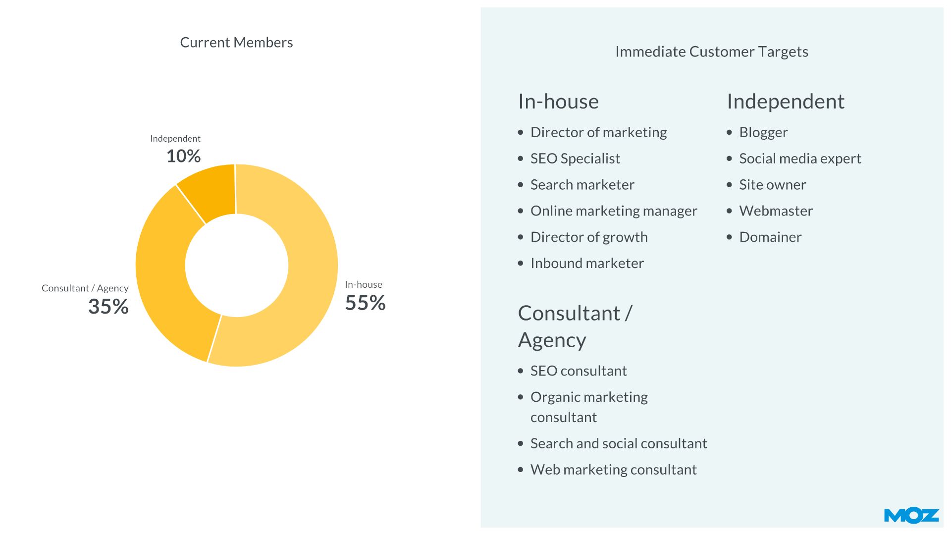 We then created a second slide to display additional information representing various Moz target customers by again customizing the donut chart template— and this time split the slide in half, dedicating one side to bulleted lists detailing the customer types.