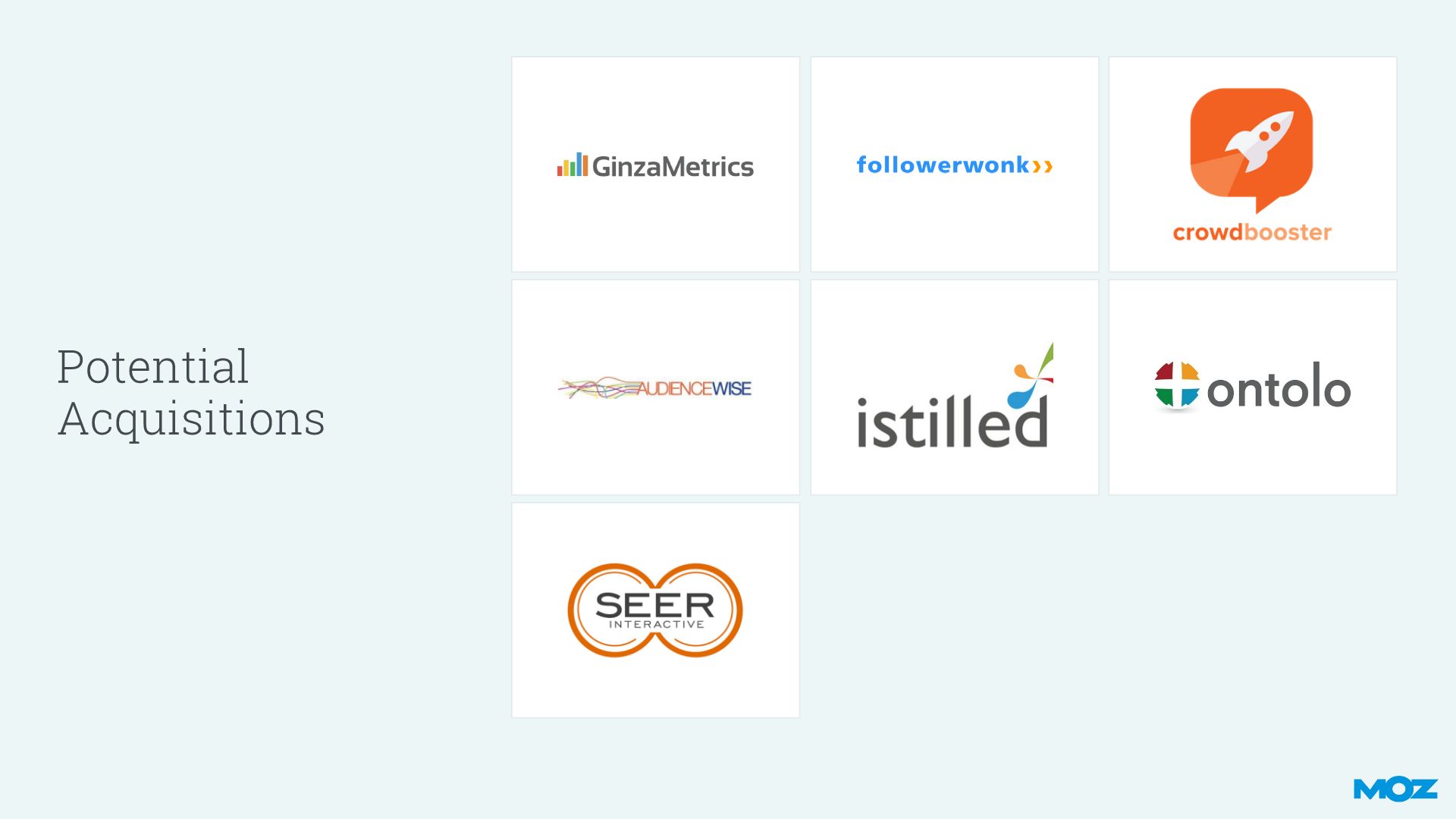 Moz's original slide highlighting the company’s potential acquisitions was informative, yet… busy. Different fonts, different colors, different sizes— absolutely no cohesion in the slide’s design. We corrected that problem with Beautiful.ai’s logo grid slide template. We easily added each item into a square on the grid, using each company’s logo pulled from our vast library. Just enter the name, and our intuitive search tool will find the company’s logo.