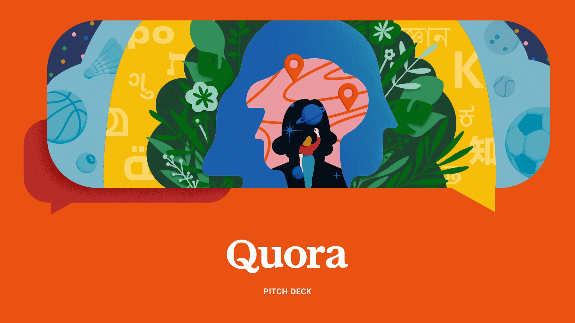 The original Quora pitch deck started out with a teaser slide, an opening graphic that catches the audience’s interest and offers a clue to the following content. Because this is a pitch deck, and audiences are already prepared for the topic, we omitted that slide in our redesigned pitch deck and instead started our deck with a bold title slide using Beautiful.ai’s Headline Smart Slide template.