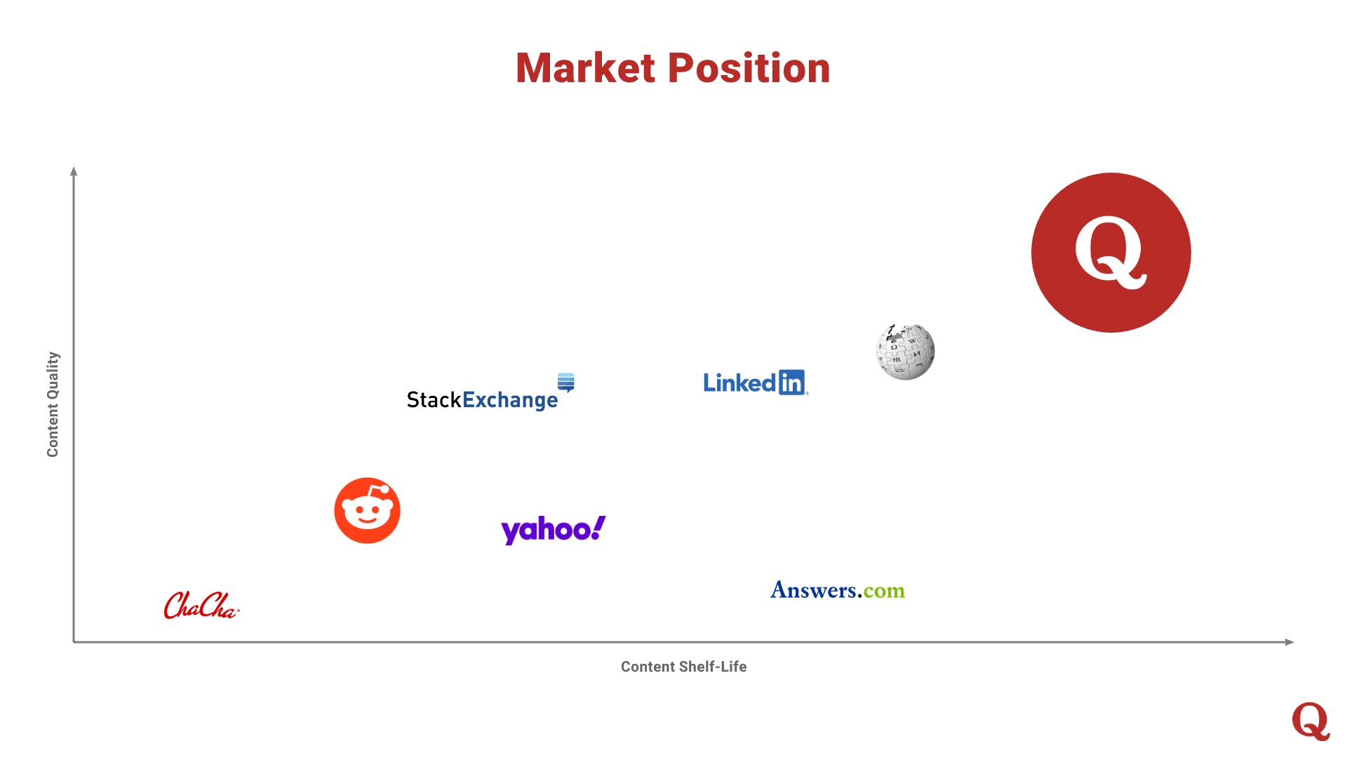 We chose to redesign another of the original Quora pitch deck’s later slides in our No. 8 position. The original slide illustrated other platforms in the 2009 market, plotted on a chart with a quadrant XY plot.