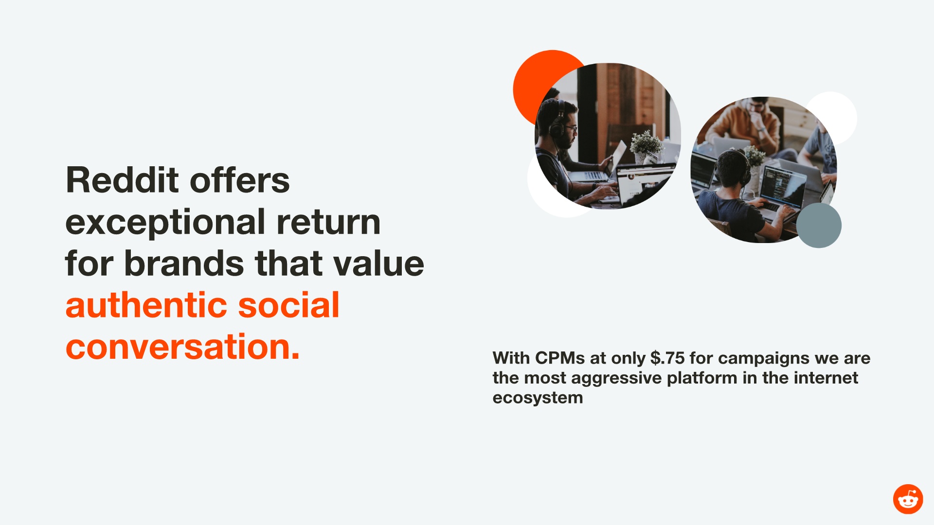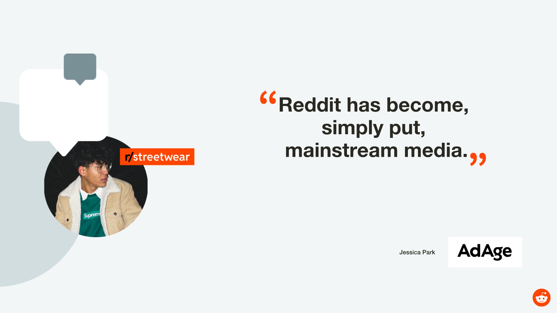 We love a good quote. Reddit’s 2014 pitch deck featured a brag-worthy statement from AdAge, marveling that the website had become, “mainstream media.” The quote was obviously important to Reddit – and effective – so we kept it in our redesigned slide deck using our Quotes Smart Slide template. Our custom color palette and typography were automatically applied to the slide, and we added a free stock photo from our image library for some extra pizzazz.