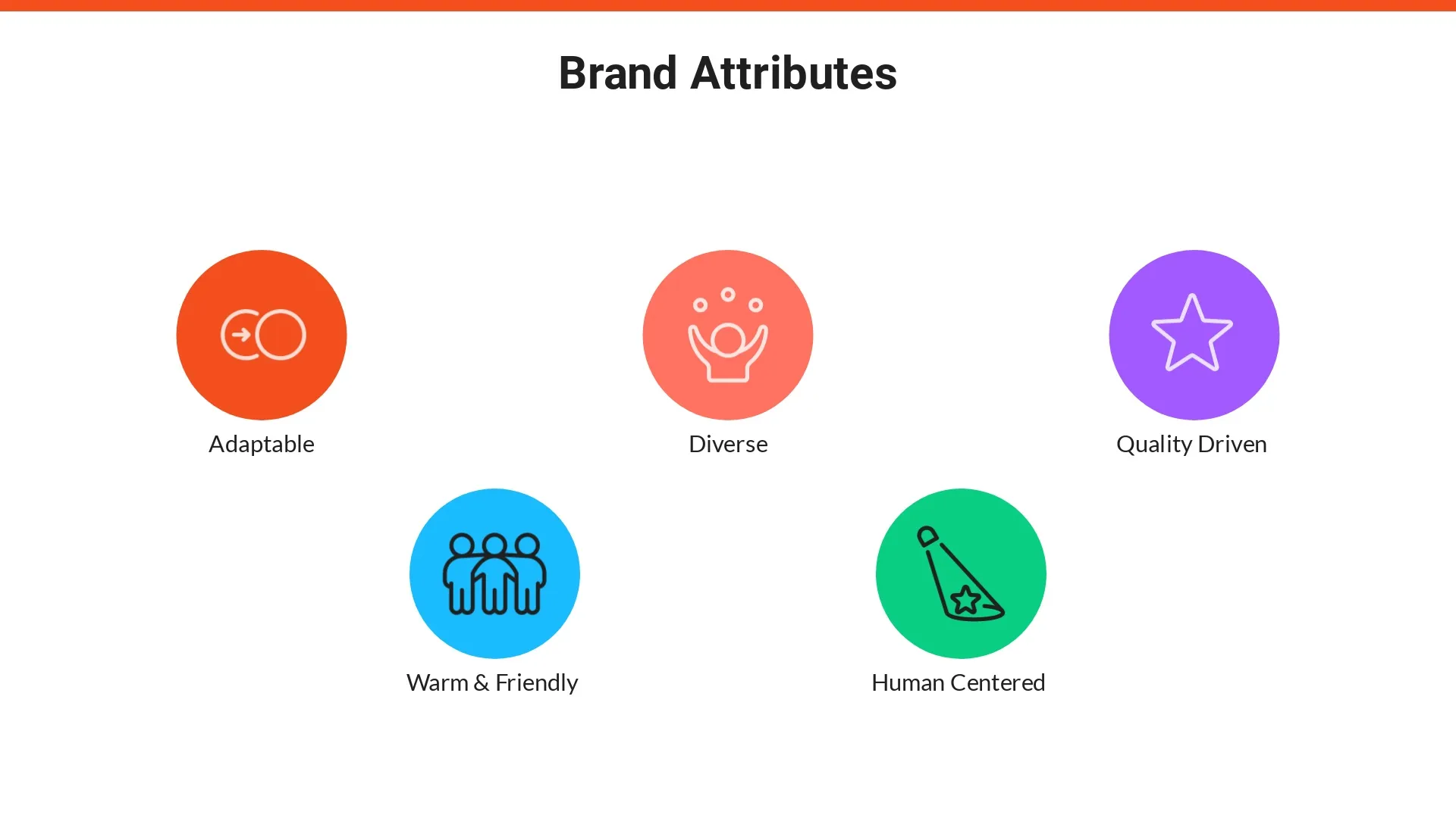 What are the key attributes of your brand? These are the characteristics and core values that make up your brand as a whole. In Figma’s case they included things like adaptable, diverse, quality driven, human centered, and warm and friendly. Use our Icons with Text slide to list out your brand attributes so that your team can understand how you landed on certain branding decisions.