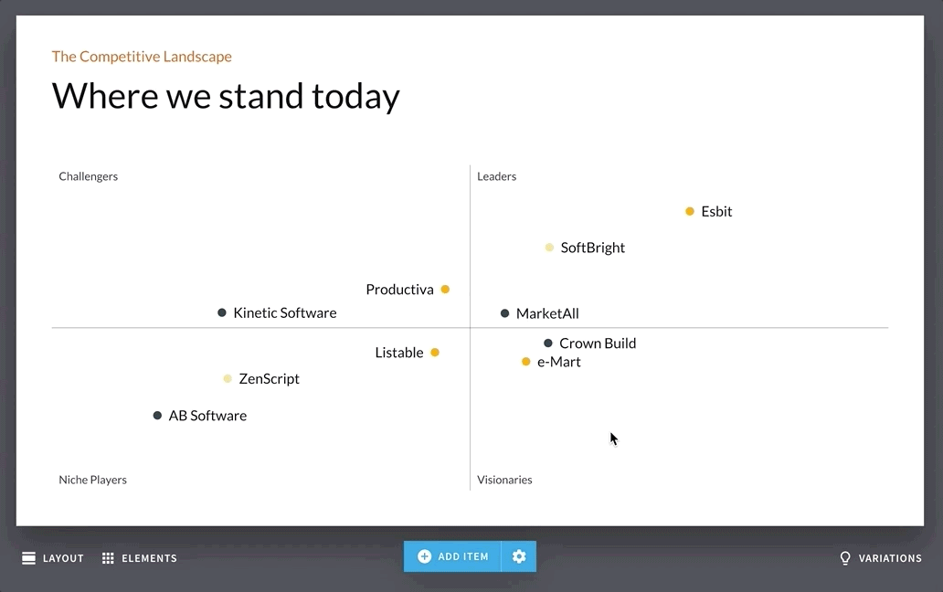 Switch between XY plot, quadrants, and bubble layouts in just one click.